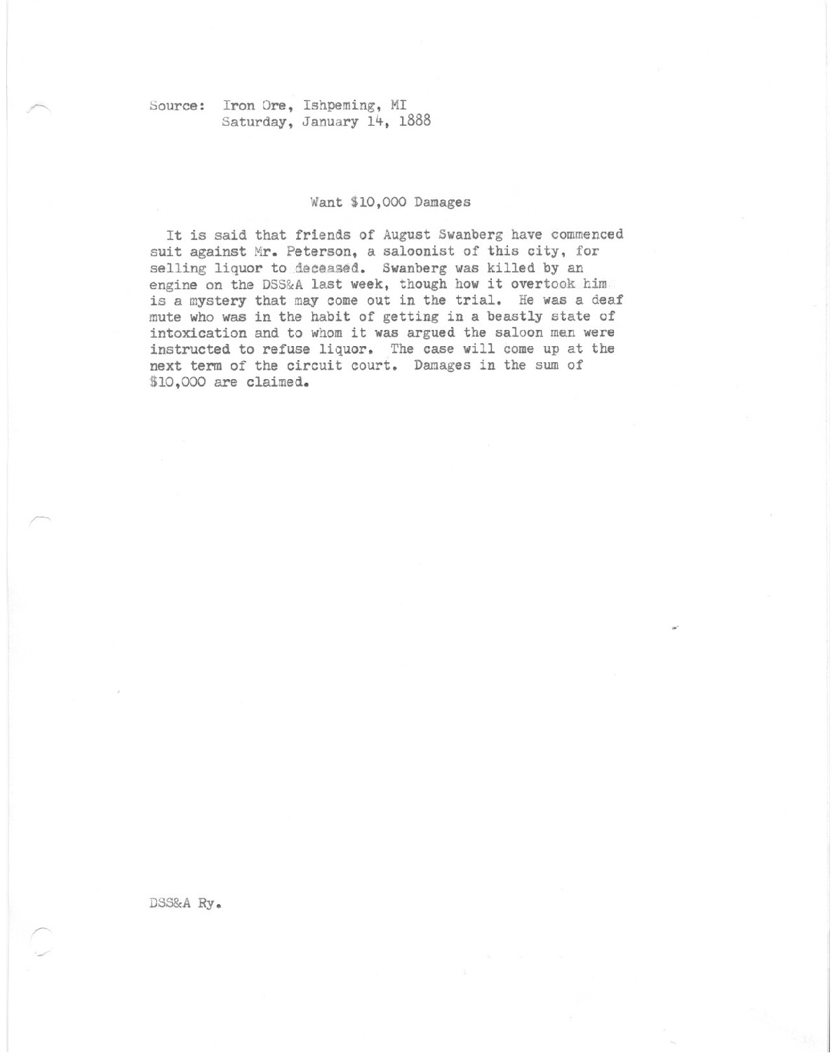 It is said that friends of August Swanberg have commened suit against Mr. Peterson, a saloonist of this city, for selling liquor to deceased. Swanberg was killed by an engine on the DSS&A last week, through how it overtook him is a mystery that may come out in trail. He was a deaf mute who was in the habit of getting in a beastly state of intoxication and to whom it was aruged the saloon men where instructed to refuse liqour. The case will come up at the next term of the Circuit Court. Damages in the sum of $10,000 are claimed.