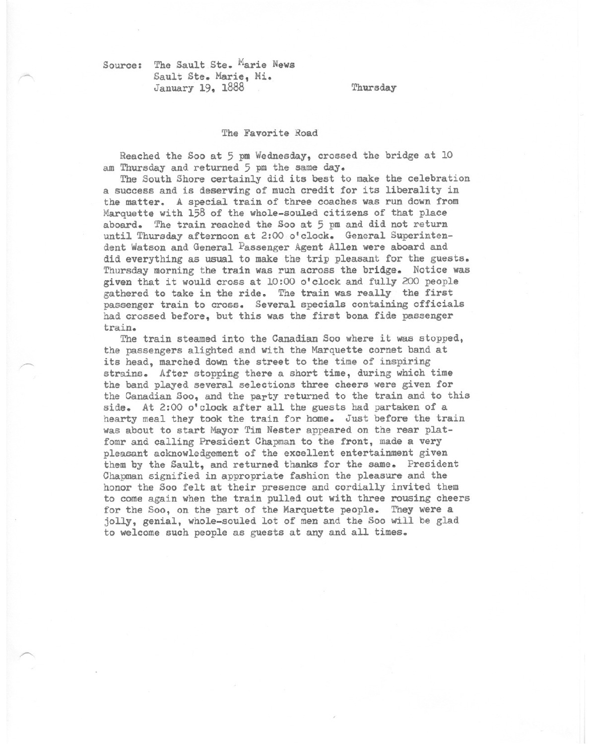 Reached the Soo at 5:00pm Wednesday, crossed the bridge at 10am Thursday and returned 5pm the same day. The South Shore certainly did its bets to make the celebration a success and is deserving of much credit for its liberality in the matter. A special train of three coaches was run down from Marquette with 158 of the whole-souled citizens of that lace aboard.