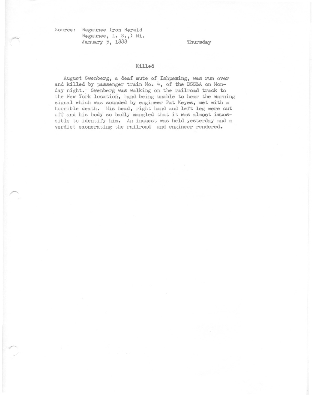 August Swenberg, a deal mute of Ishpeming was run over and killed by passenger train number 4, of the DSS&A on Monday night. Swenberg was walking on the railroad track to the New York location, and being unable to hear the warning signal which was sounded by engineer Pat Keyes met with a horrible death. His head, right hand and left leg were cut off and his body so badily mangled that it was almost impossible to identify him. An inquest was held yesterday and a verdict exonerating the railroad and engineer rendered.