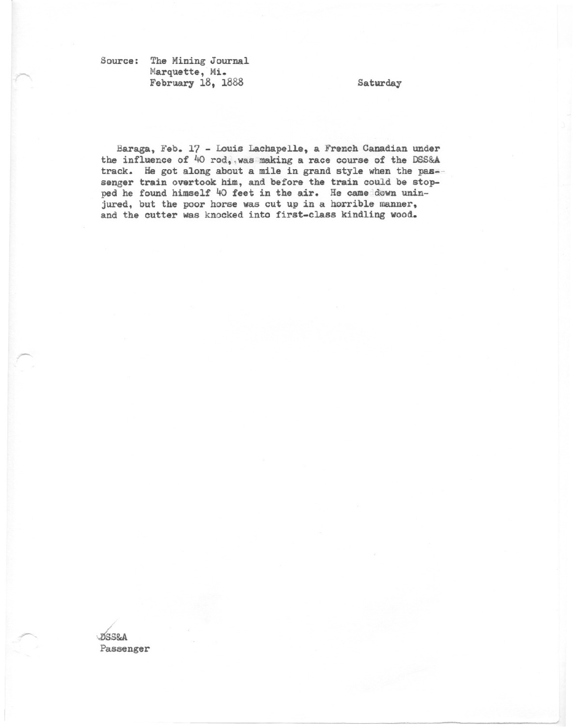 A french Canadian under the influence of 40 rod, was making a race course of the DSS&A track. He got along about a mile in grand style when the passnger train overtook him, and before the train could be stopped he found himself 40 feet in the air, he came down uninjued, but the poor horse was cut up in a horrible manner and the cutter was knocked into first class kindling wood.