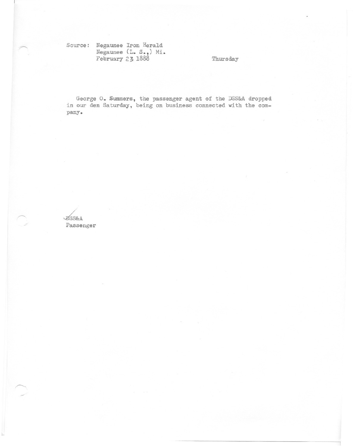 George O. Summers, the passenger of the DSS&A dropped in our den Saturday, being on business connected with the company.
