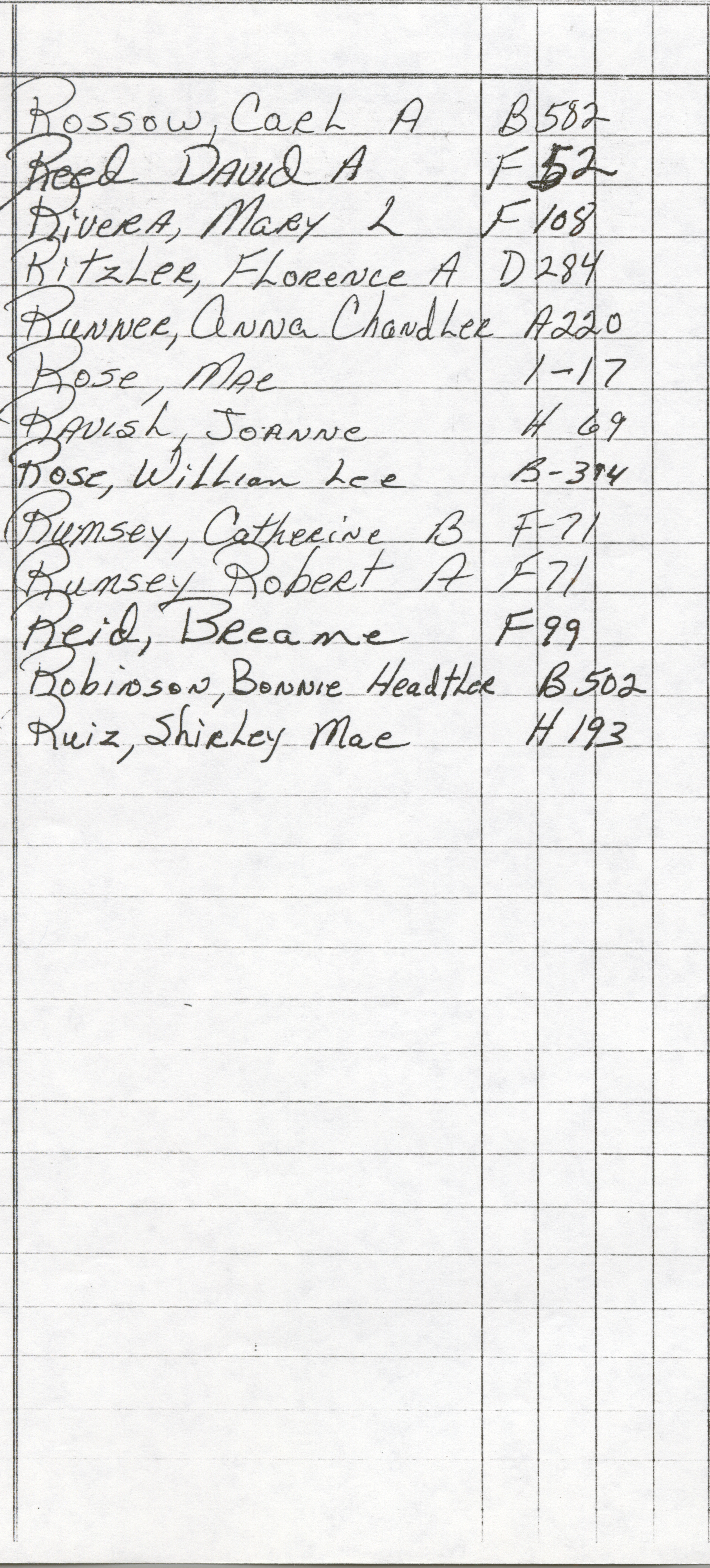 Part 1: Carl Rossow, David Reed, Mary Rivera, Florence Ritzler, Anna Runner, Mae Rose, Joanne Ravish, William Rose, Catherine Rumsey, Robert Rumsey, Breane Reid, Bonnie Robinson, Shirley Ruiz.