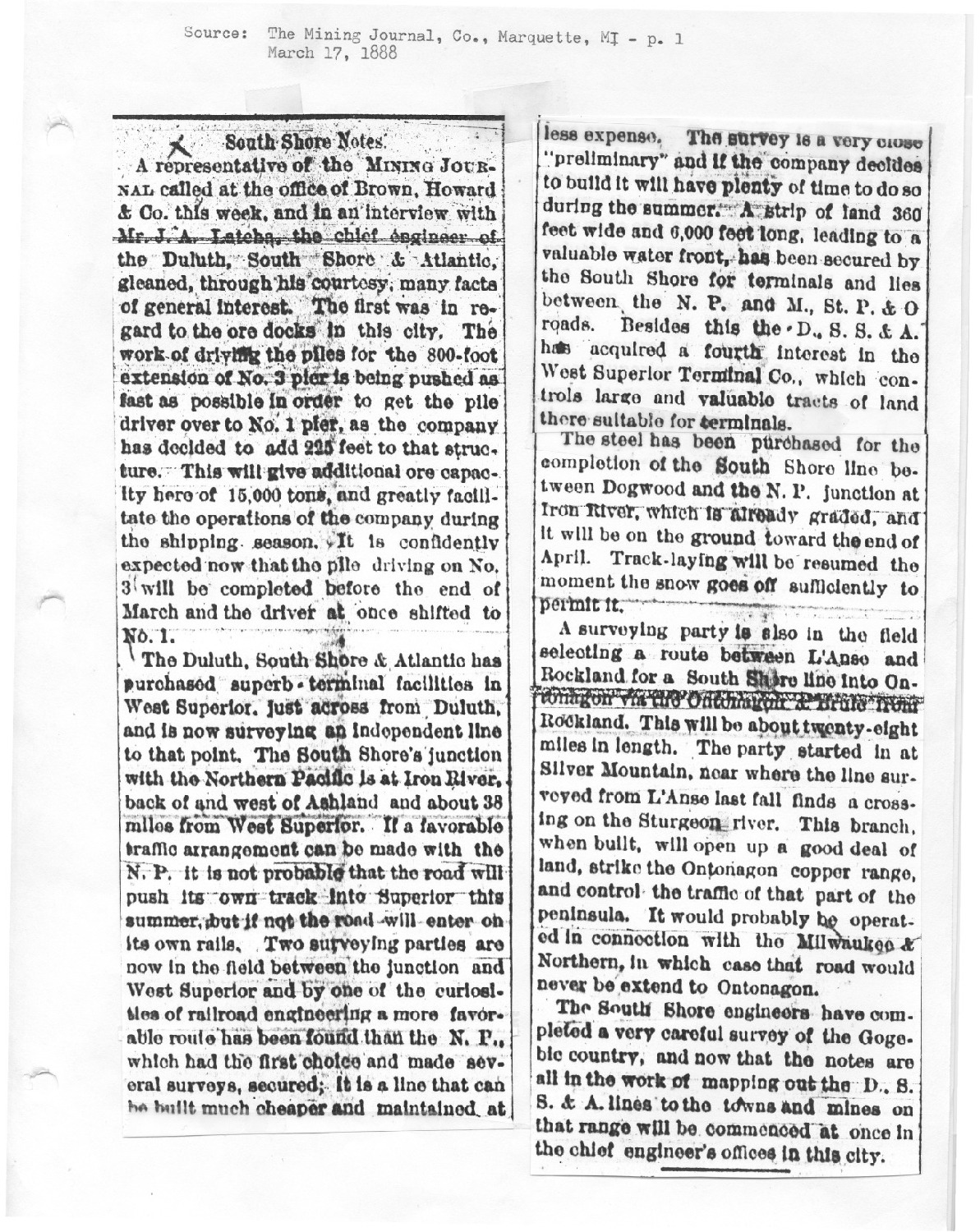 A represntative of the Mining Journal called at the office of Brown, Howard & Co, this week and in an interview with Mr. J. A. Latcha, the chief engineer of Duluth South Shore & Atlantic , gleaned, through his countesy, many facts of general interest.