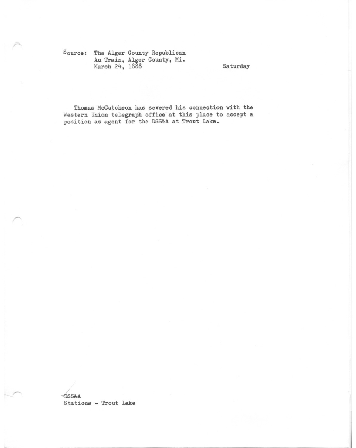 Thomas McCutcheon has served his connection with the Western Union telegraph office at this place to accept a position as agent for the DSS&A at Trout Lake.