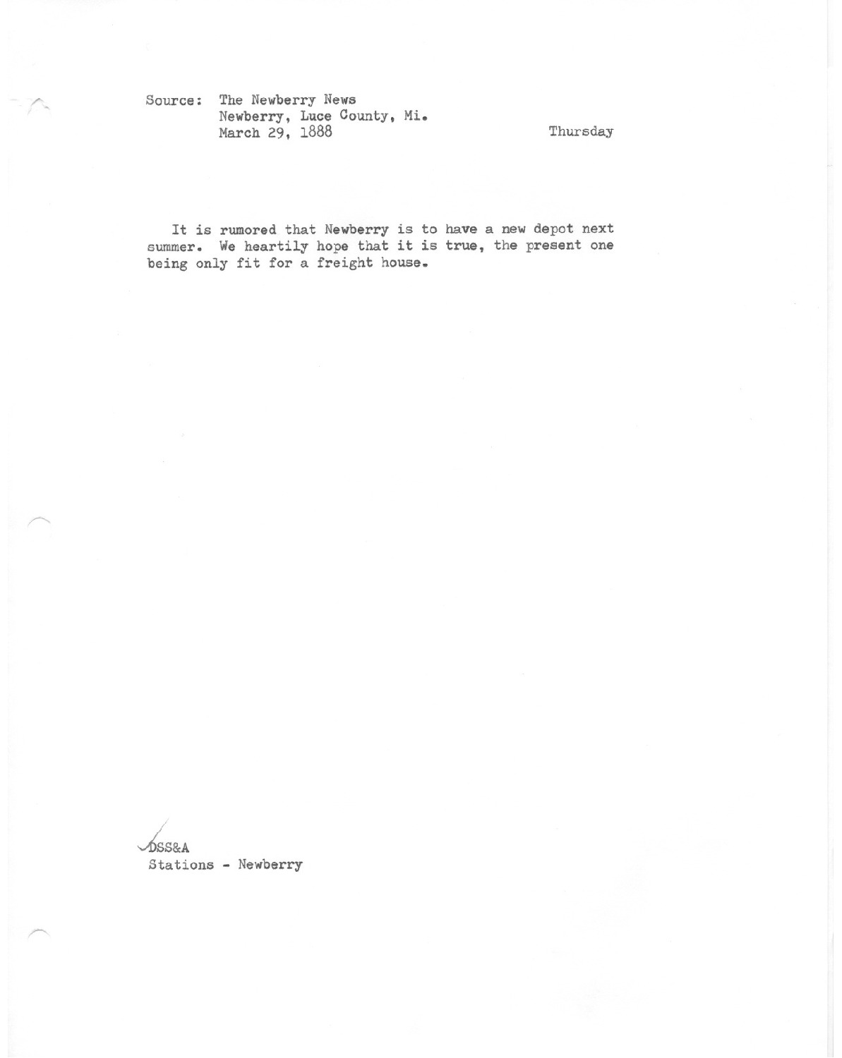 It is rumored that Newberry is to have a new depot next summer. We heartily hope that it is true, the present one being only fit for a freight house.