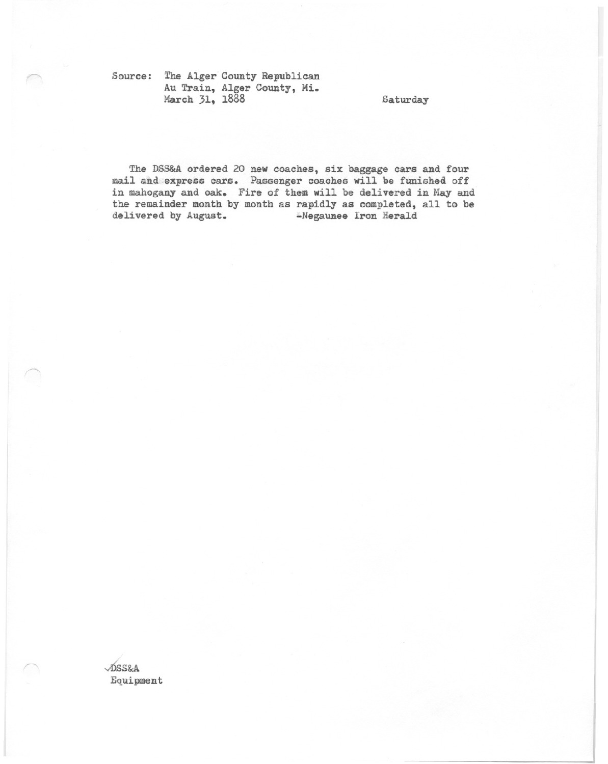 DSS&A ordered 20 new coaches, six baggage cars and four mail and express cars. Passenger coaches wil be funished off in mahogany and oak. Five of them will be delivered in May and the remainder month by month as rapidly as completed, all to be delivered by August.