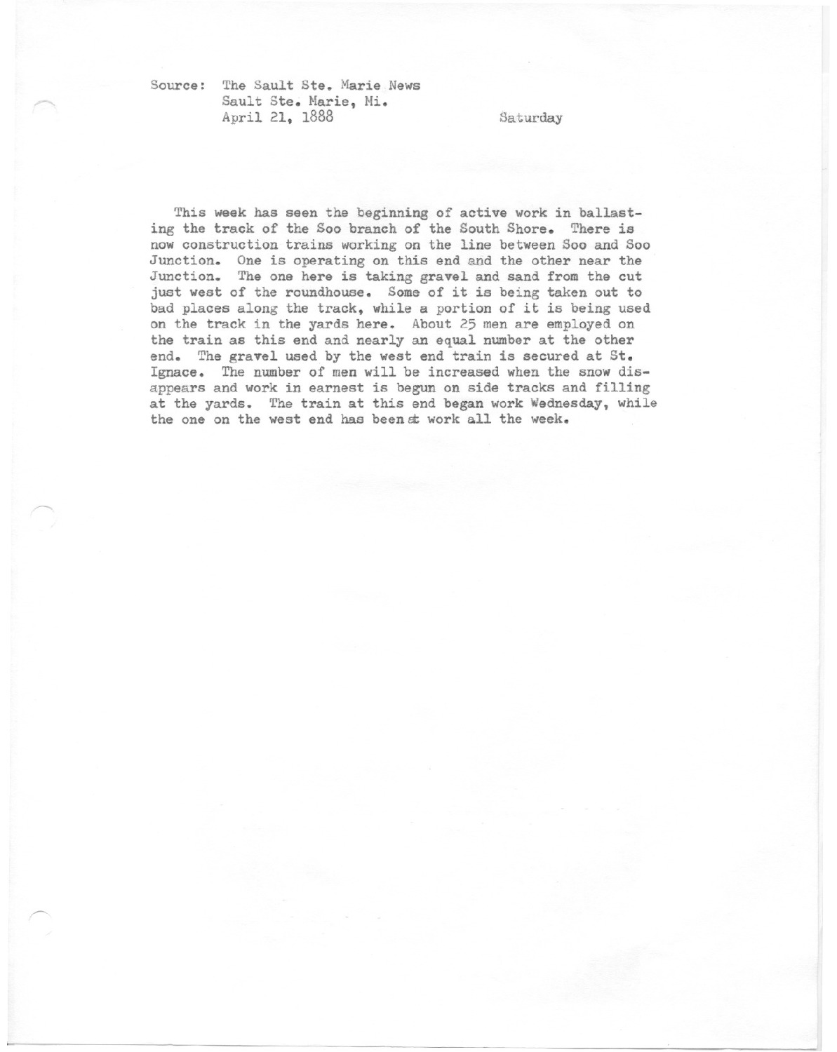 This week has seen the beginning of active work in ballasting the track of the Soo branch of the South Shore. There is now construction trains working on the line between Soo and Soo Junction.