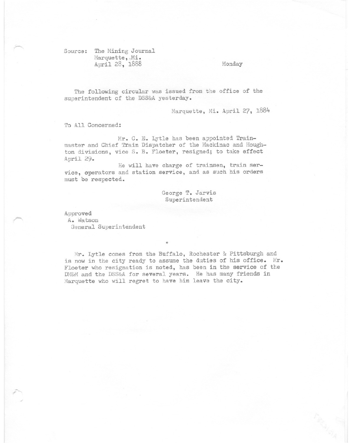 The following circular was issued from the office of the superintendent of the DSS&A yesterday. Mr. C. E. Lytle has been appointed Trainmaster and Chief Train Dispatcher of the Mackinac and Houghton divisions, vice S. B. Floeter, resigned; to take effect April 29.