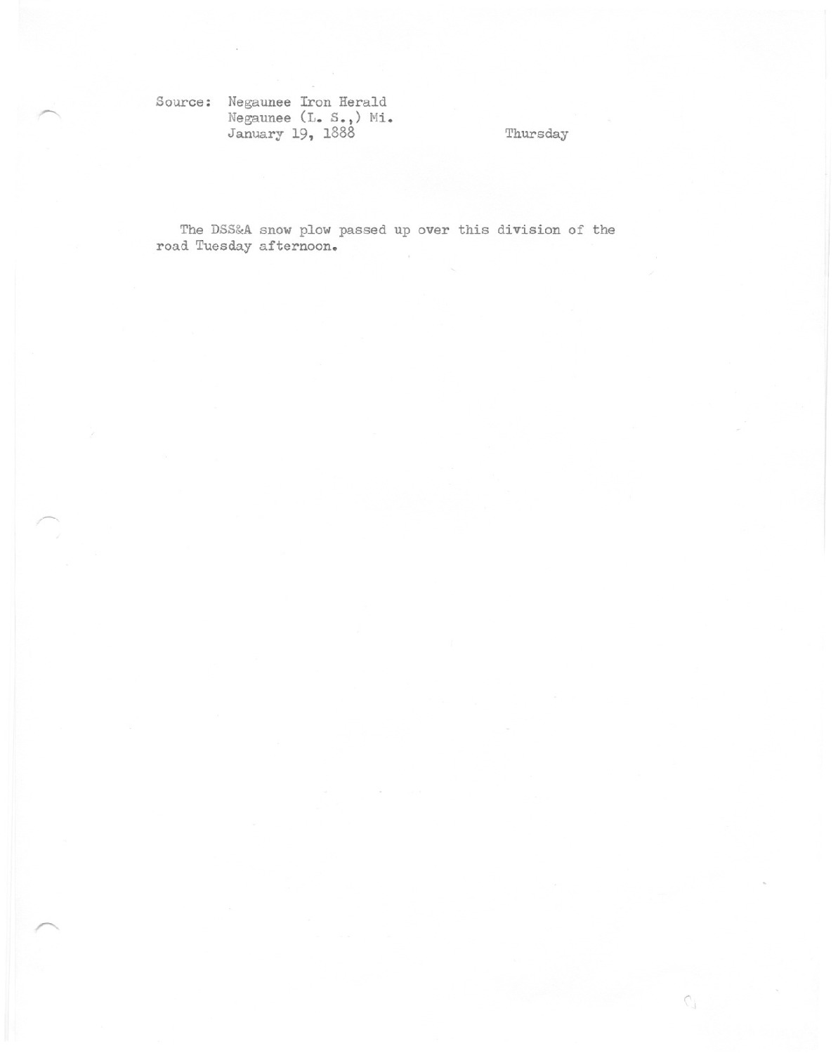 The DSS&A snow plow passed up over this divison of the road Tuesday afternoon.