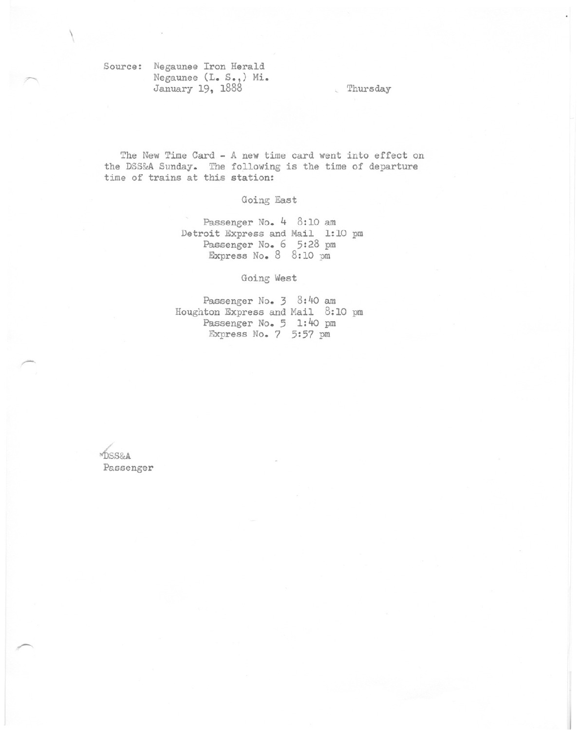 New time card went into effect on the DSS&A Sunday. The following is the time of departure time of trains at this station: Going East: Detroit and Going West Sault.