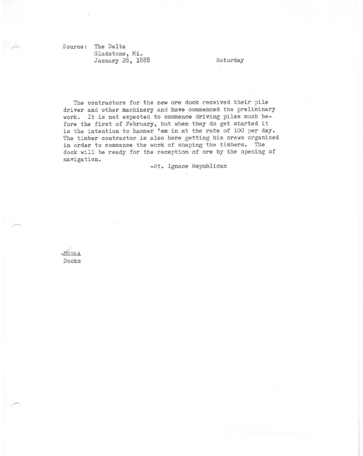 The contractors for the new ore dock received their pile driver and other machinery and have commenced the preliminary work. It is not expected to commence driving piles much before the first of February, but when they do get started it is the intention to hammer em in at the rate of 100 day. The timber contractor is also here getting his crews organized in order to commence the work of shaping the timbers. The dock will be ready for the recpetion by ore by the opening of naviagation.