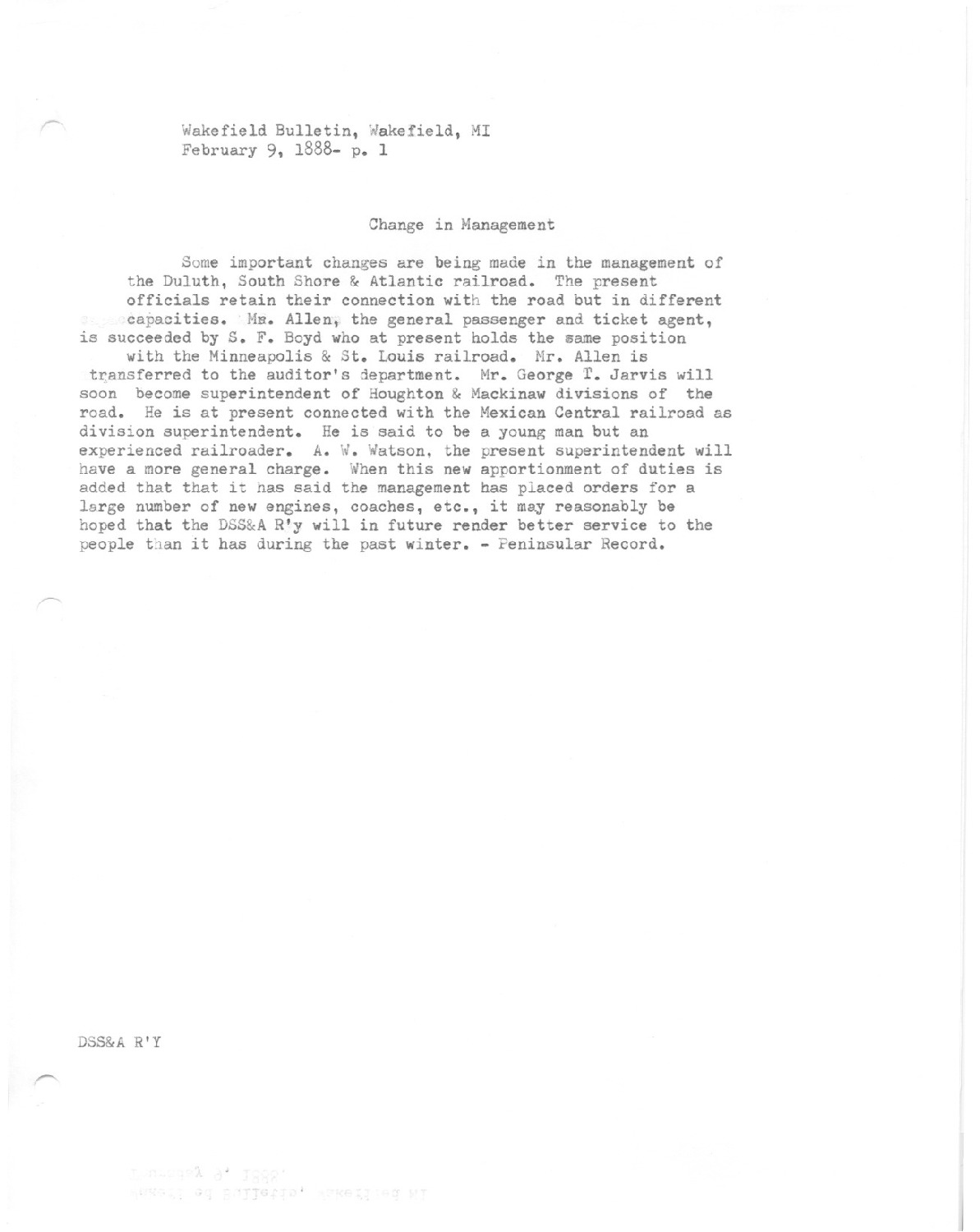 Some important changes are being made in the management of the Duluth South Shore & Atlantic railroad. The present officals retain their connection with the road but in different capacities. Mr. Allen, the general passenger and ticket agent, is succeeded by S. F. Boyd who at present holds the same position with the Minneapolis & St Louis Railroad.