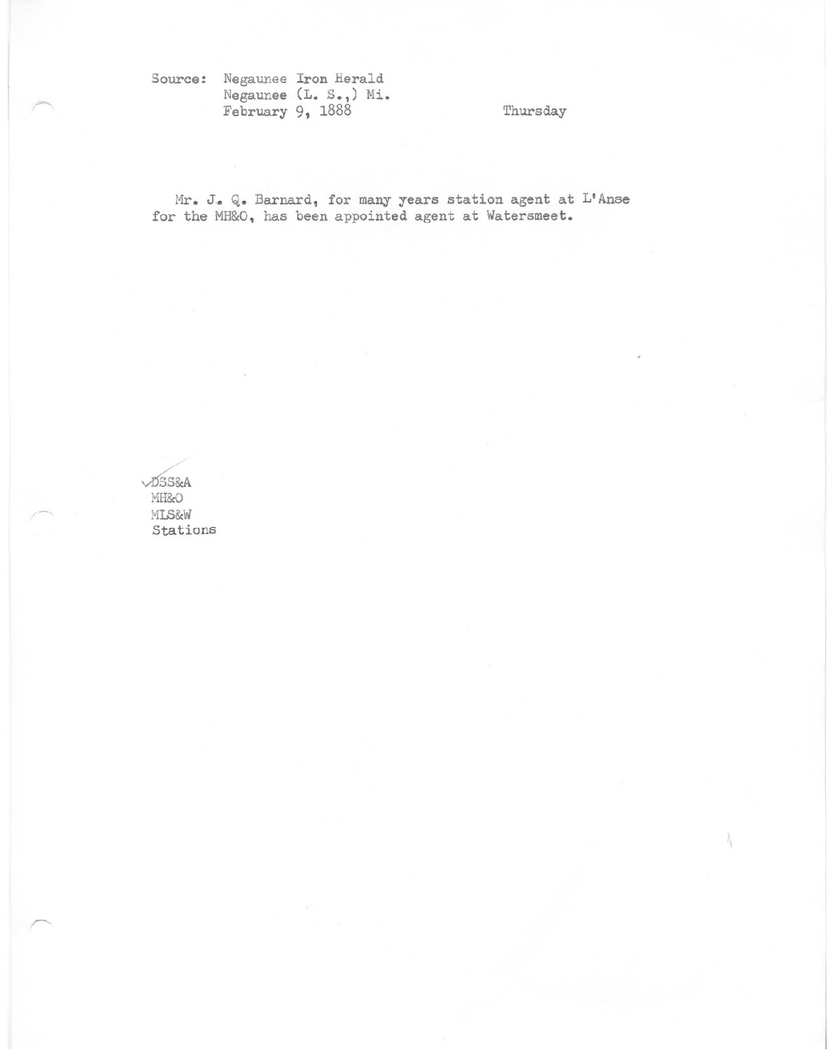 Mr. J. Q. Barnard, for many years station agent at L'anse for the MH&O, has been appointed agent at Watersmet.