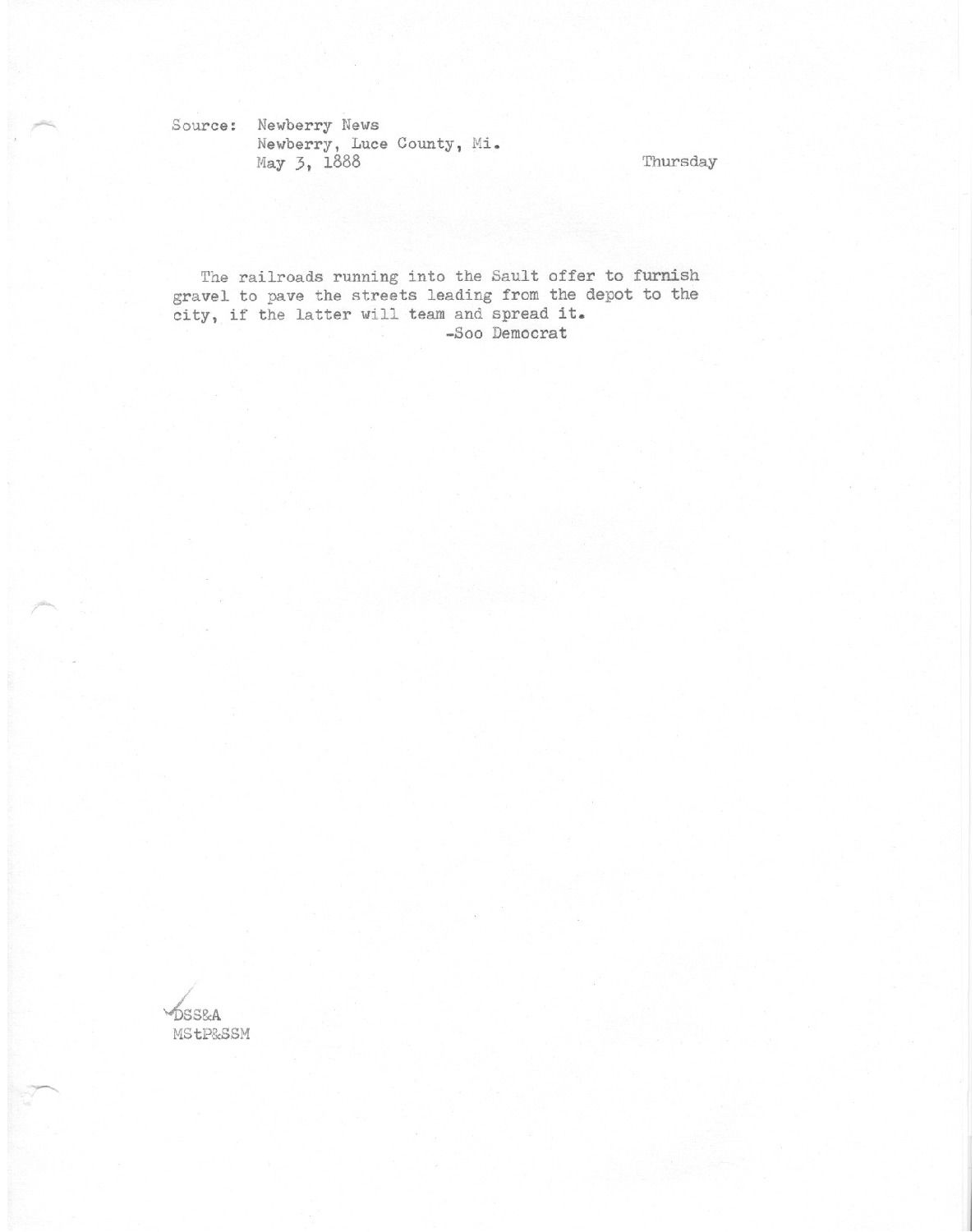 The railroads running into the Sault offer to furnish gravel to pave the streets leading from the depot to the city, if the latter will team and spread it.