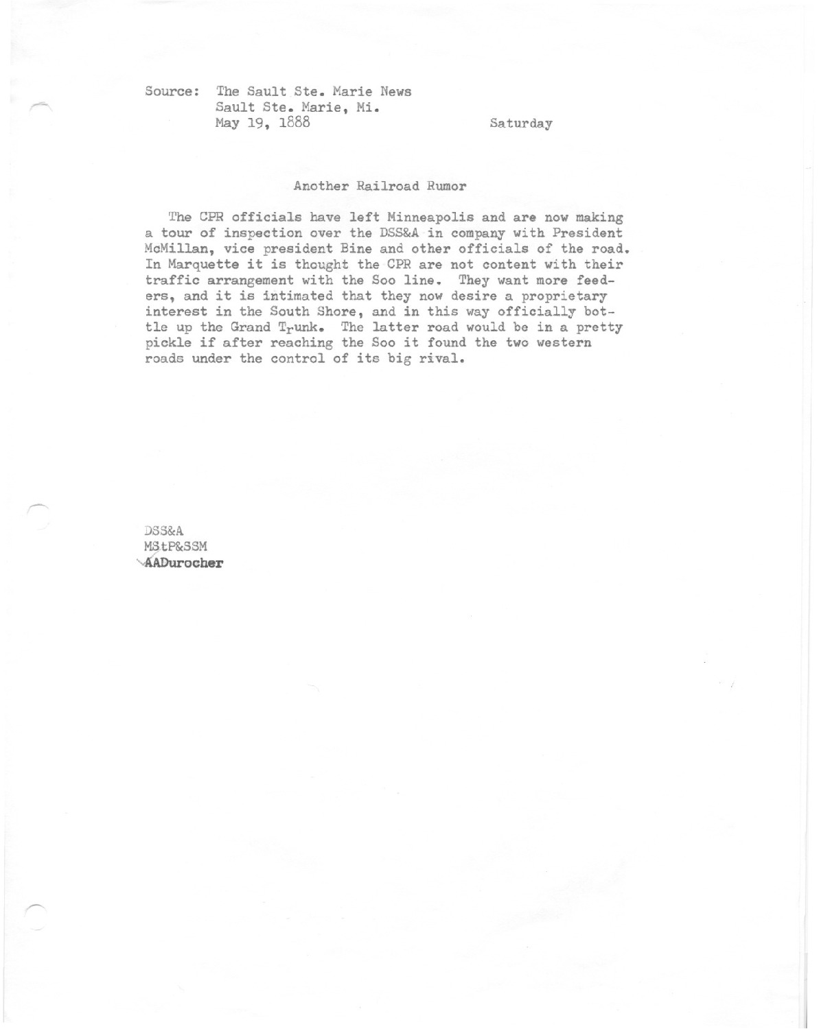 The CPR officals have left Minneapolis and are now making a tour of inspection over the DSS&A in company with President McMillian, vice president Bine and other officals of the road. In Marquette it is thought the CPR are not content with their traffic arrangement with the Soo line. They want more feeders, and it is intimated that they now desire a propietary interest in the south shore, and in this way officially bottle up the Grand Trunk. The latter road would be in a pretty pickle if after reaching the Soo it found the two western roads under the control of its big rival.