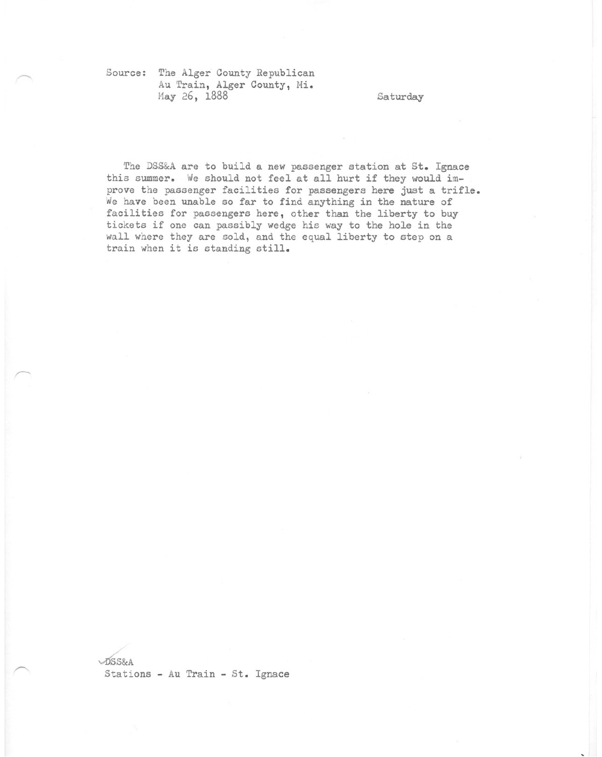 The DSS&A are to build a new passenger station at St. Ignance this summer. We should not feel at all hurt if they would improve the passenger facilities for passngers here just a trifle. We have been unable so far to find anything in the nature of facilities for passengers here, other than the liberty to buy tickets if one can possibly wedge his way to the hole in the wall where they are sold, and the equal liberty to stop on a train when it is standing still.