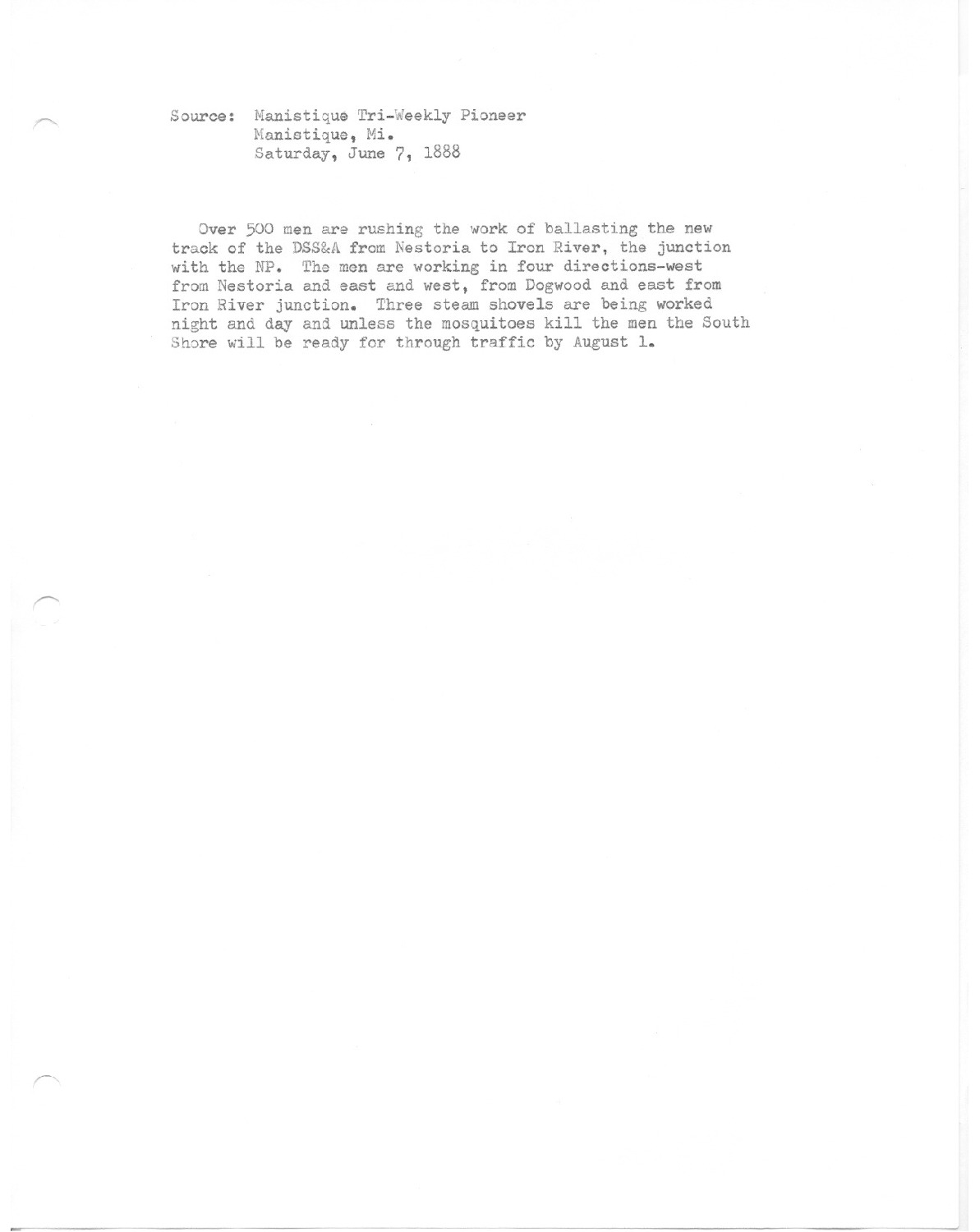 Over 500 men are rushing the work of ballasting the new track of the DSS&A from Nestoria to Iron River, the junction with the NP. The men are working in four directions; West from Nestoria, East and West, from Dogwood and east from Iron River junction. Three steam shovels are being worked night and day and unless the mosquitoes kill the men the South Shore will be ready for through traffic by August 1.