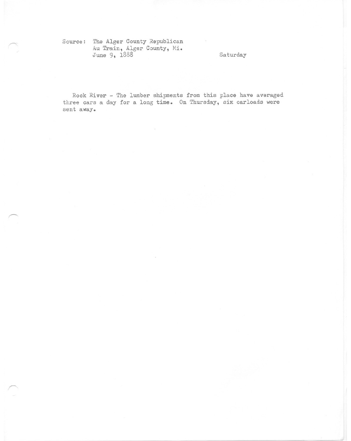 The lumber shipments from this place have averaged three cars a day for a long time. On Thursday six carloads were went away.