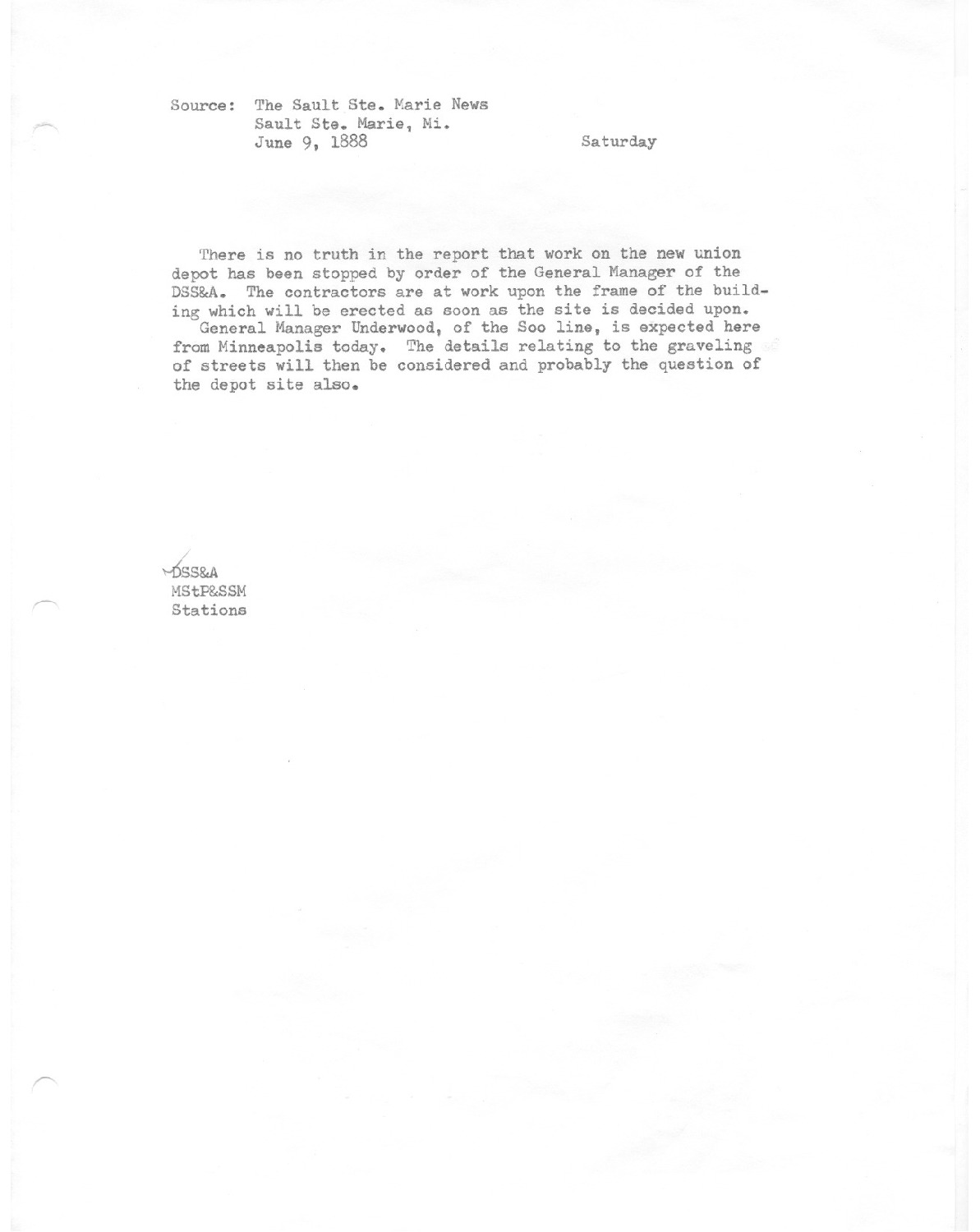 There is no truth in the report that work on the new union depot has ben stopped by order of the General Manager of the DSS&A.