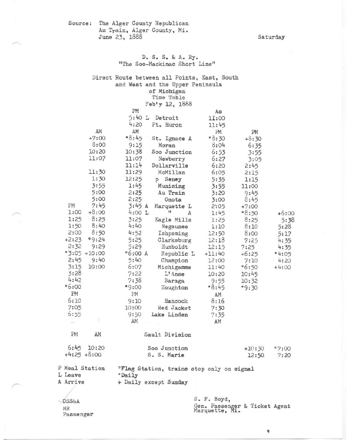 Direct Route between all Points, East, South and West and the Upper Peninsula of Michigan Time Table Feburary 12, 1888.