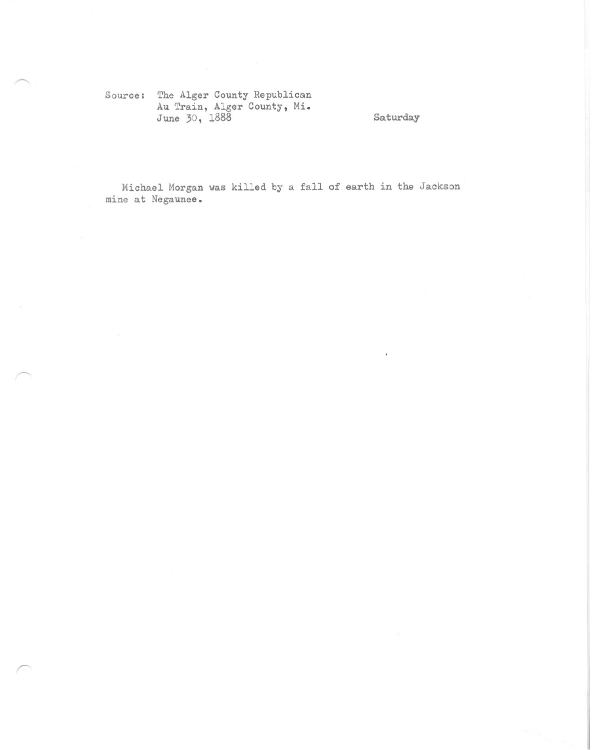 Michael Morgan was killed by a fall of earth in the Jackson mine at Negaunee.