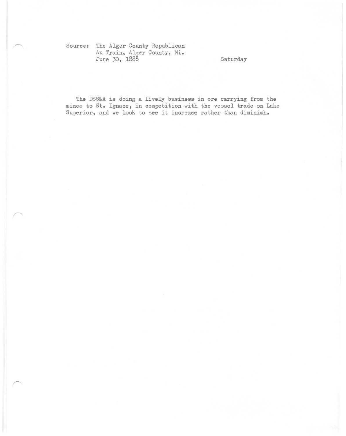 DSS&A is doing a lively business in ore carrying from the mines to St. Ignace, Michigan in competition with the vessel trade on Lake Superior, and we look to see it increase rather than diminish.