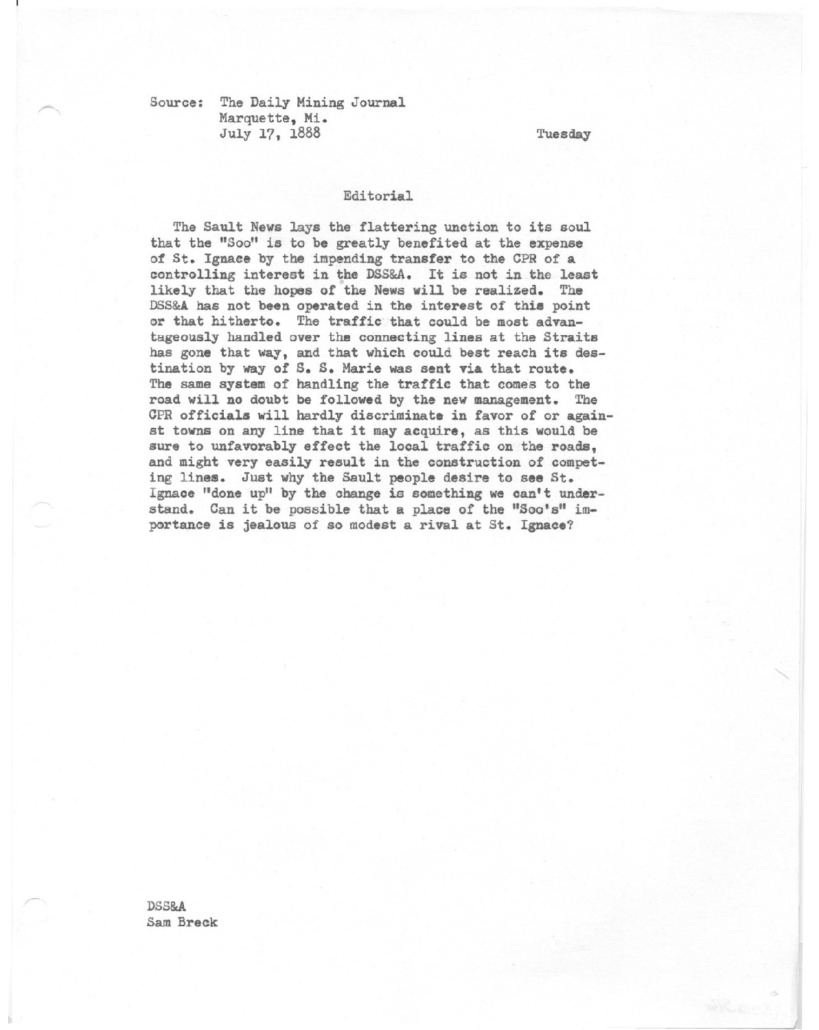 The Sault Ste Marie lays the flattering unction to its soul that the Soo is to be greatly benefited at the expense of St. Ignace by the impending transfer to the CPR of a controlling interest in the DSS