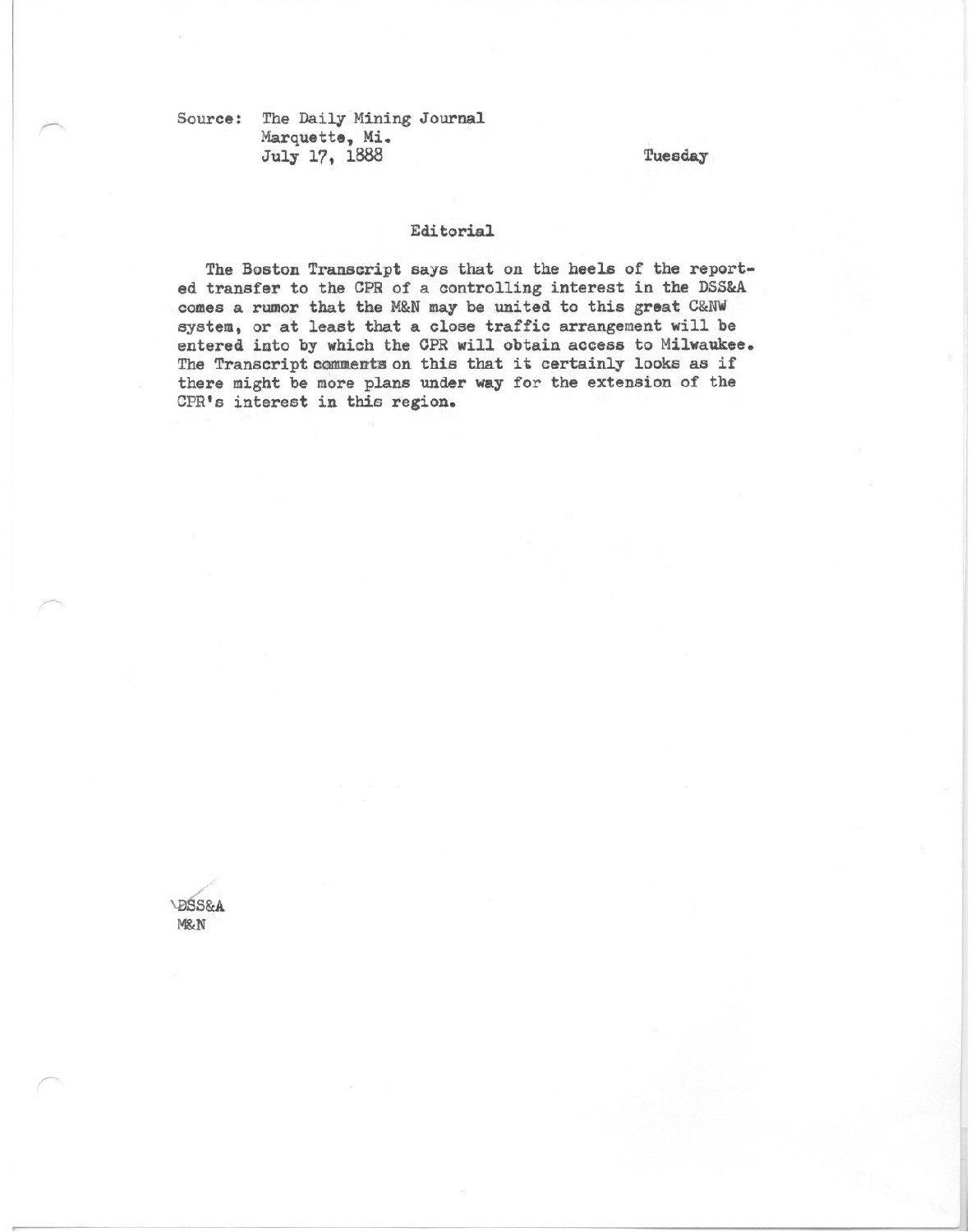 Boston Transcript says that on the heels of the reported transfer of the CPR of a controlling interest in the DSS&A comes a rumor that the M&N may be united to this great C&NW system, or at least that a close traffic arrangement will be entered into by which the CPR will obtain access to Milwaukee.