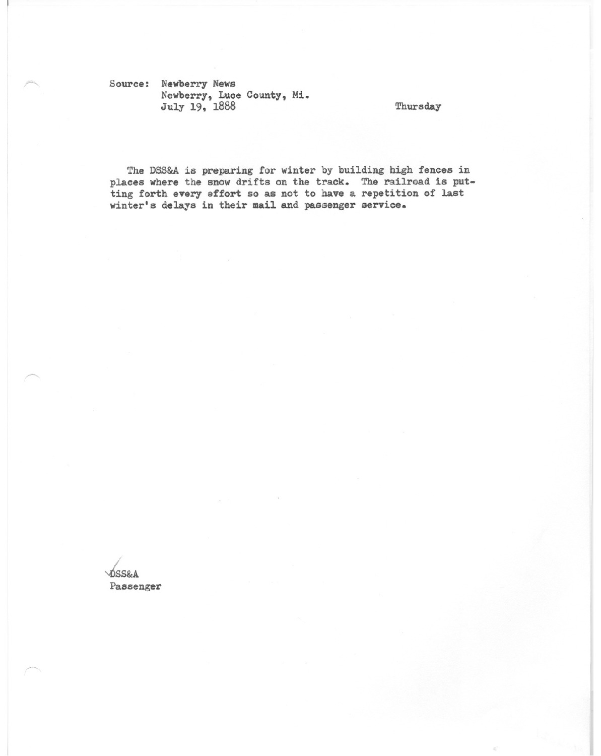 DSS&A is preparing for winter by building high fences in places where the snow drifts on the track. The railroad is putting forth every effort so as not to have a reeptition of last winter's delays in their mail and passenger service.