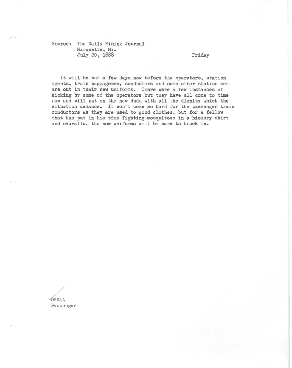 It will be but a few days now before the operators station agents, train baggamen, conductors and some other station men are out in their new uniforms. There were a few instances of kicking by some of the operators but they have all come to time now and will put on the new duds with all the dignity which the situation demands.