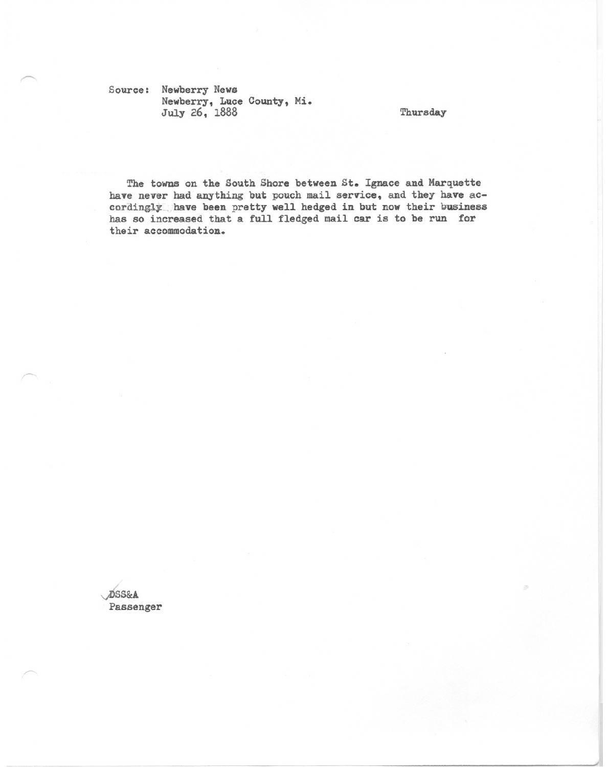 Towns on the South Shore between St. Igance and Marquette have never had anything but pouch mail service, and they have accordingly have been pretty well hedged in but now their business has so increased that a full fledged mail car is to be run for their accommodation.