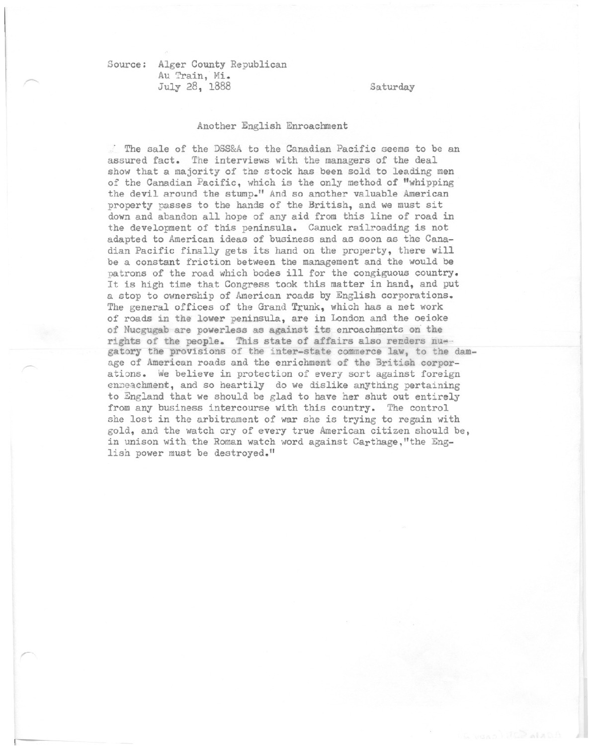 The sale of the DSS&A Railroad to the Canadian Pacific Railroad seems to be an assured fact. The interviews with the managers of the deal show that a majority of the stock has been sold to leading men of the C.P. Railroad which is only a method of whipping the devil around the stump. So another american property passes into the hands of the British.