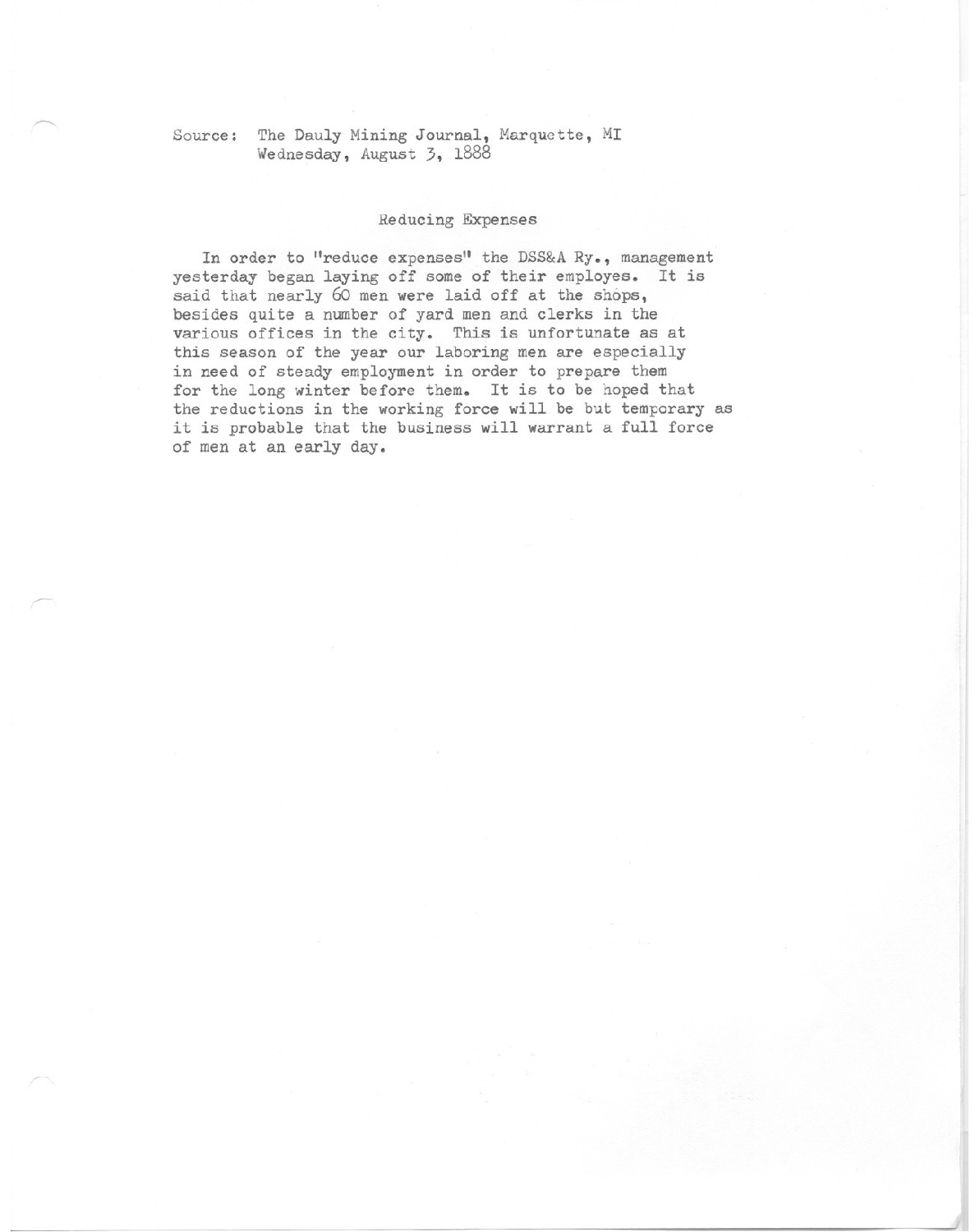 In order to reduce expenses the DSS&A Railroad management yesterday began laying off some of their employees. It is said that nearly 60 men were laid off at the shops, besides quite a number of yard men and clerks in the various offices in the city. This is unfortunate as at this season of the year our laboring men are especially in need of steady employment in order to prepare them for the long winter before them. It is to be hoped that the reductions in the working force will be but temporary as it is probable that the business will warrant a full force of men at an early day.