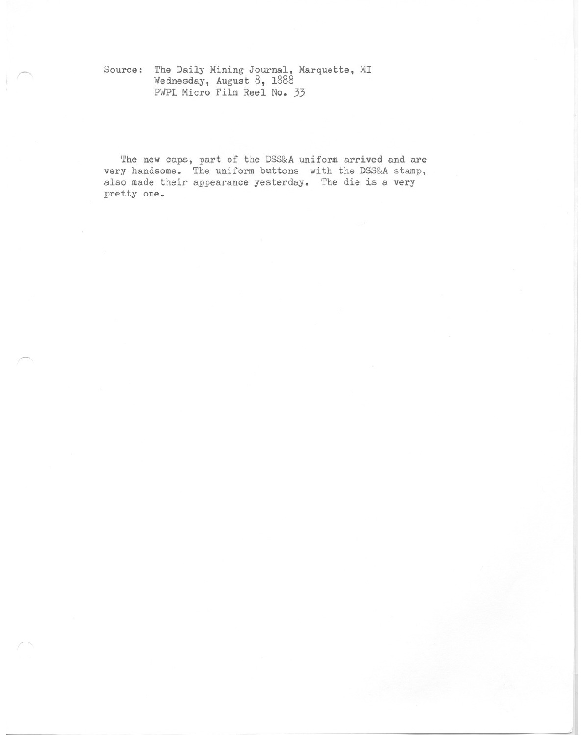 New caps, part of the DSS&A uniform arrived and are very handsome. The uniform buttons with the DSS&A stamp, also made their appearance yesterday. The die is a very pretty one.