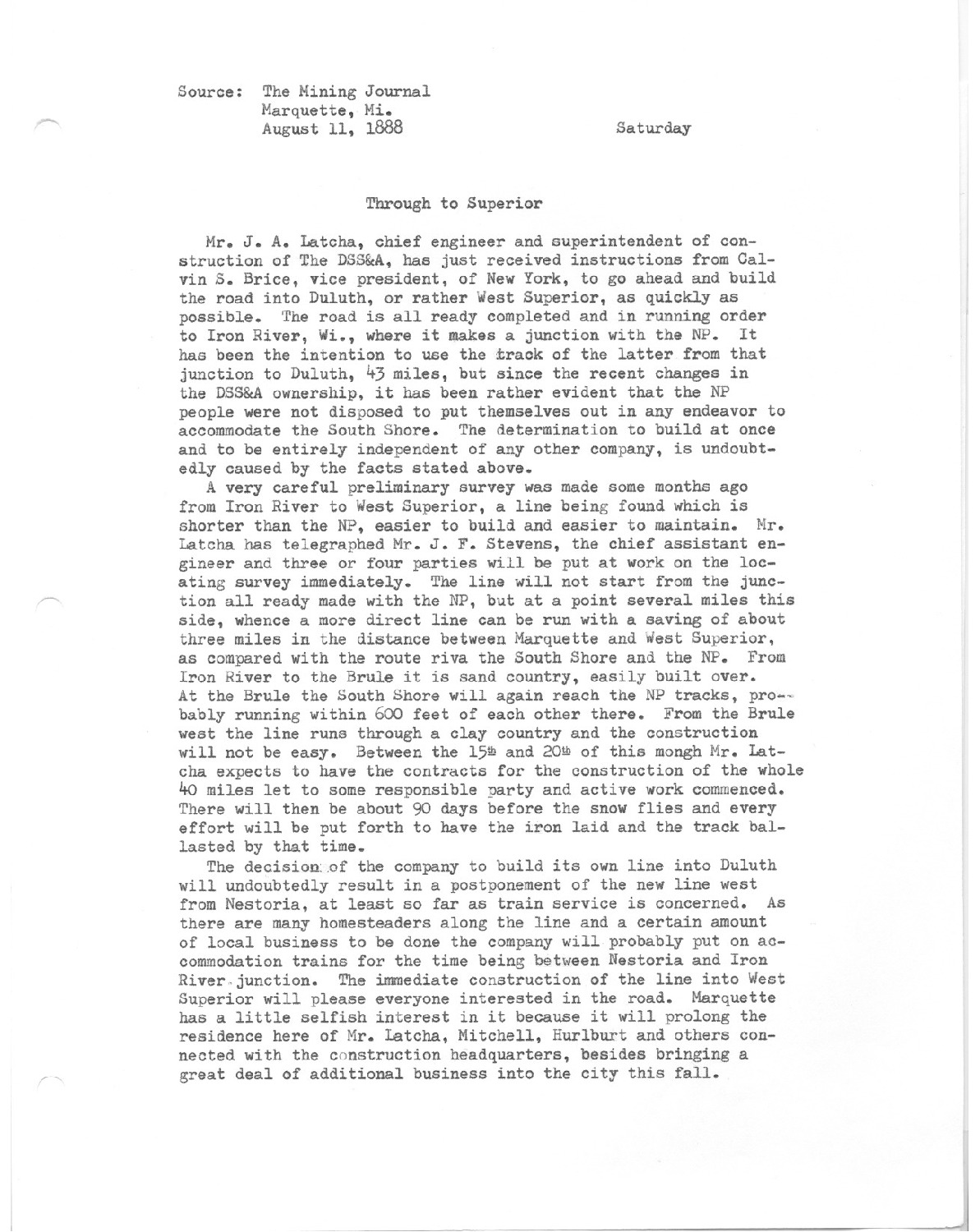 Mr. J. A. Latcha, chief engineer and superintendent of construction of the DSS&A has just received instructions from vice president Calvin S. Brice of New York, to go ahead and build the road into Duluth or rather West Superior, as quickly as possible.