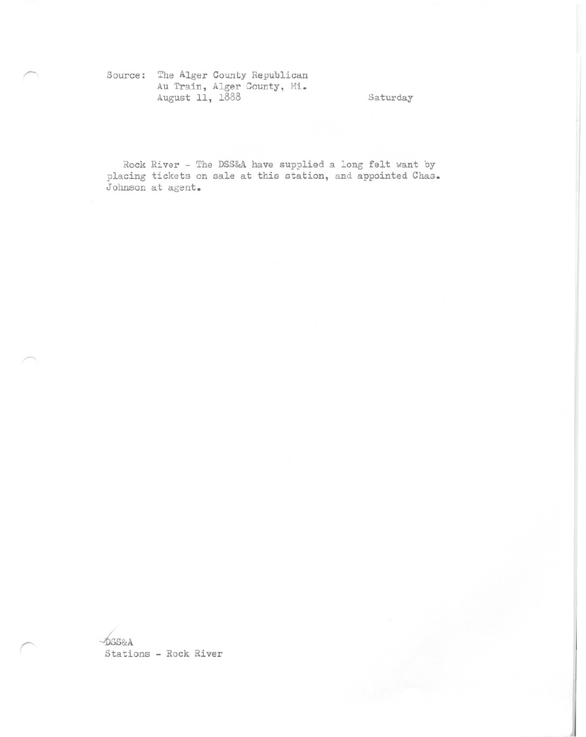 The DSS&A have supplied a long felt want by placing tickets on sale at this station, and appointed Charles Johnson as agent.