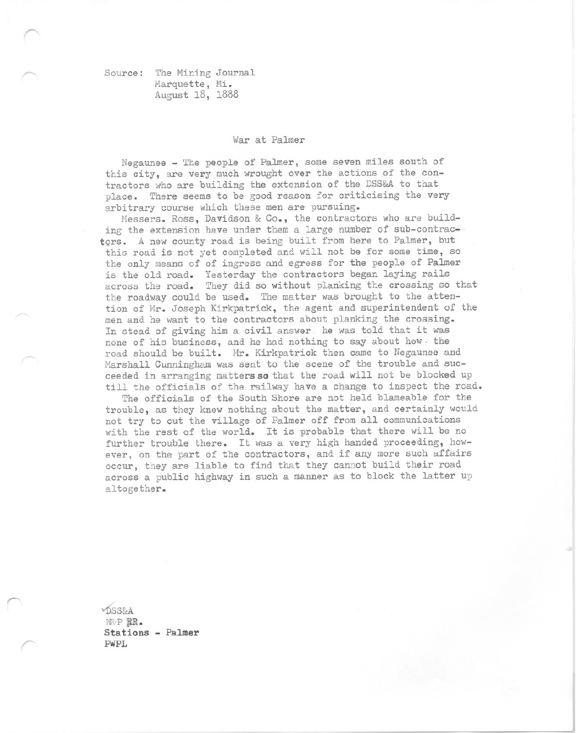 The people of palmer some 7 miles south of the city are very much wrought over the actions of the contractors who are building the extension of the DSS&A to that place.
