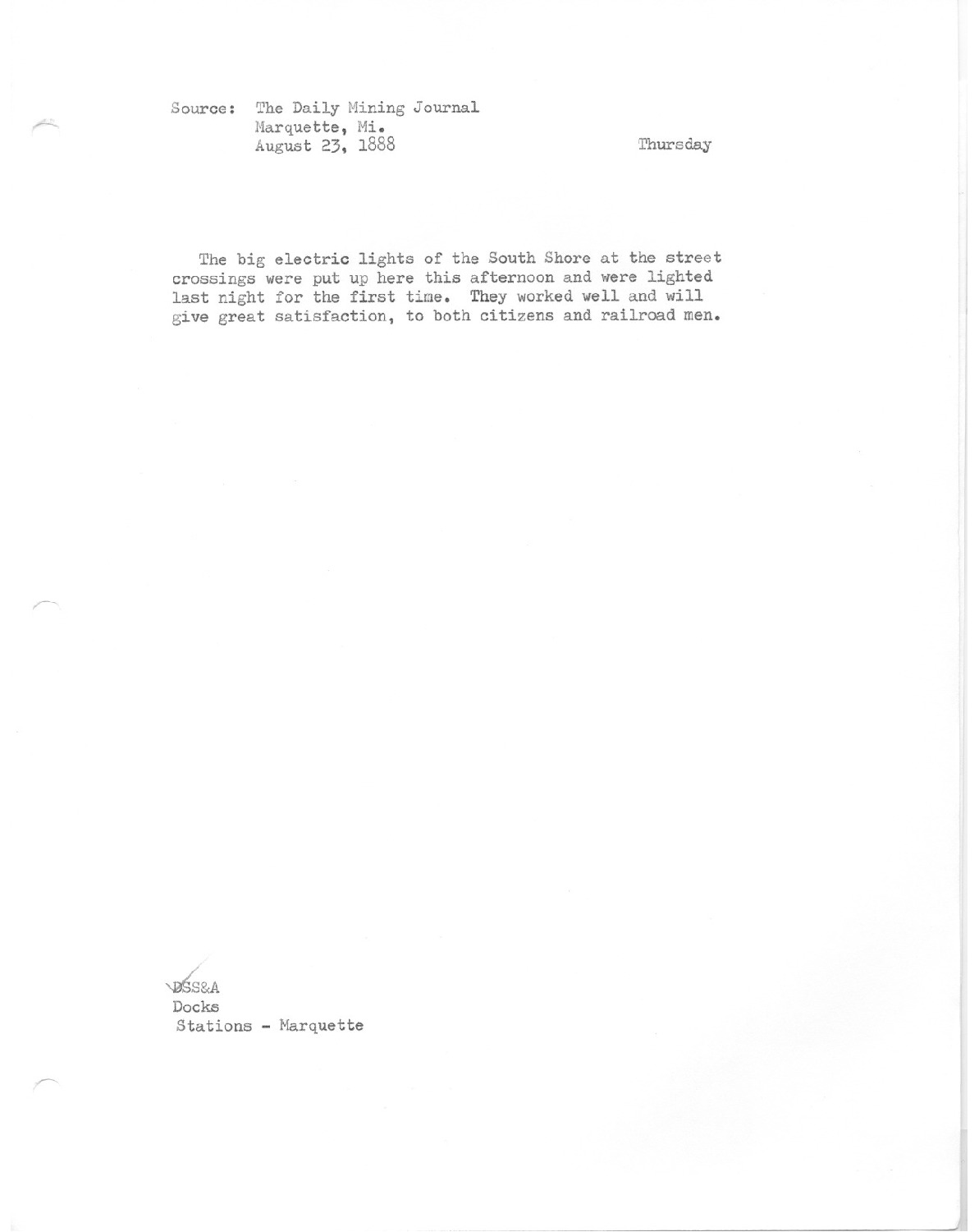 Big electric lights of the South Shore at the street crossings were put up here this afternoon and were lighted last night for the first time. They worked well and will give great satisification to both citizens and railroad men.