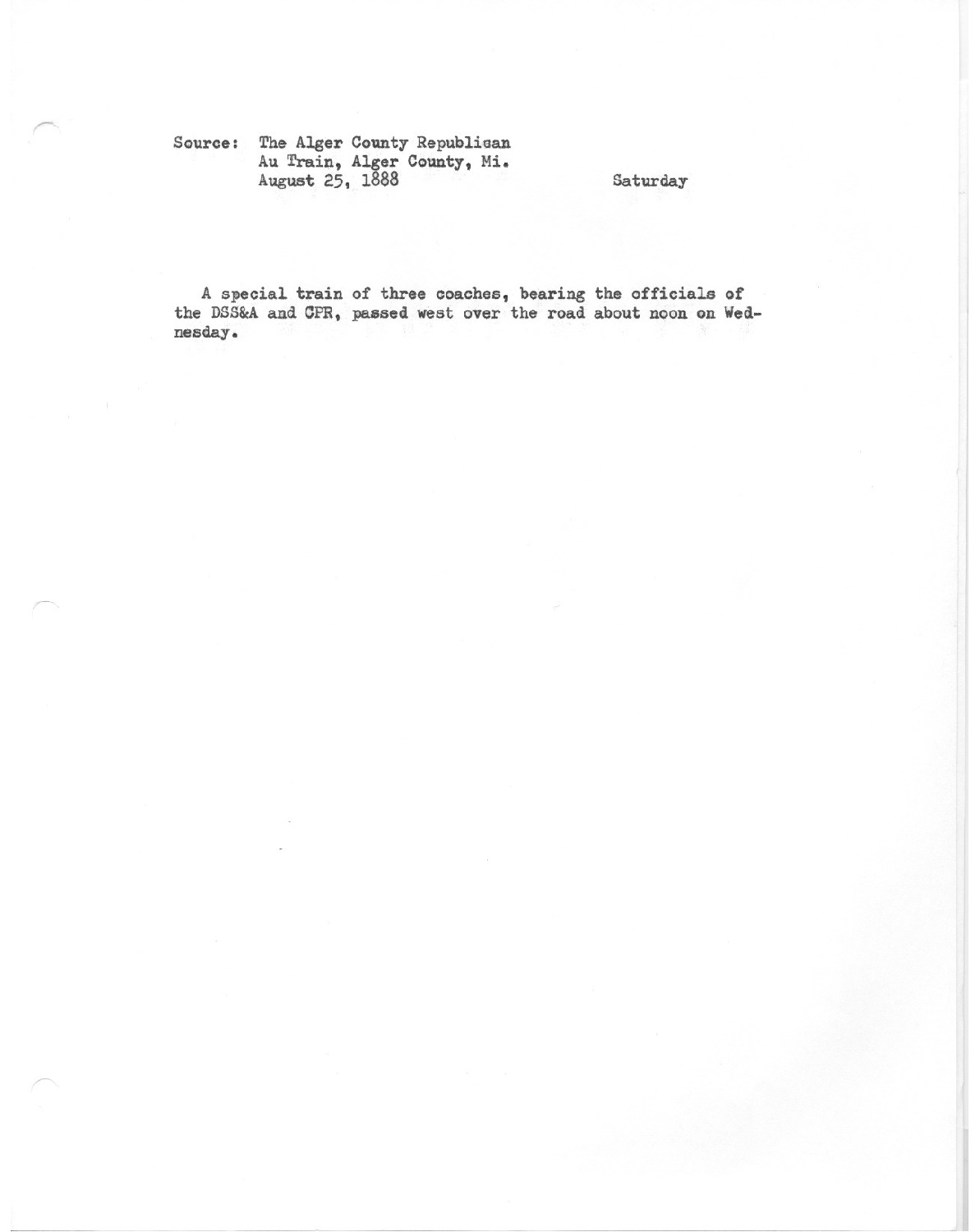 Special train of three coaches, bearing the officals of the DSS&A and CPR, passed west over the railroad about noon on Wednesday.