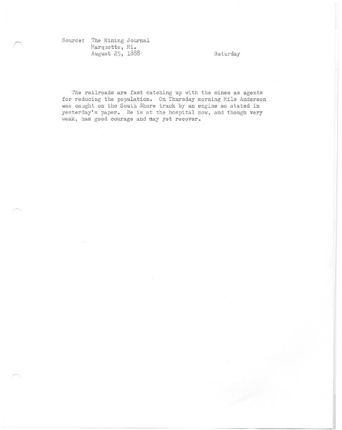 Railroads are fast catching up with the mines as agents for reducing the population. On Thursday morning Mils Anderson was caught on the South Shore track by an engine as stated in yesterday's paper. He is at the hospital now, and though very weak, has good courage and may yet recover.