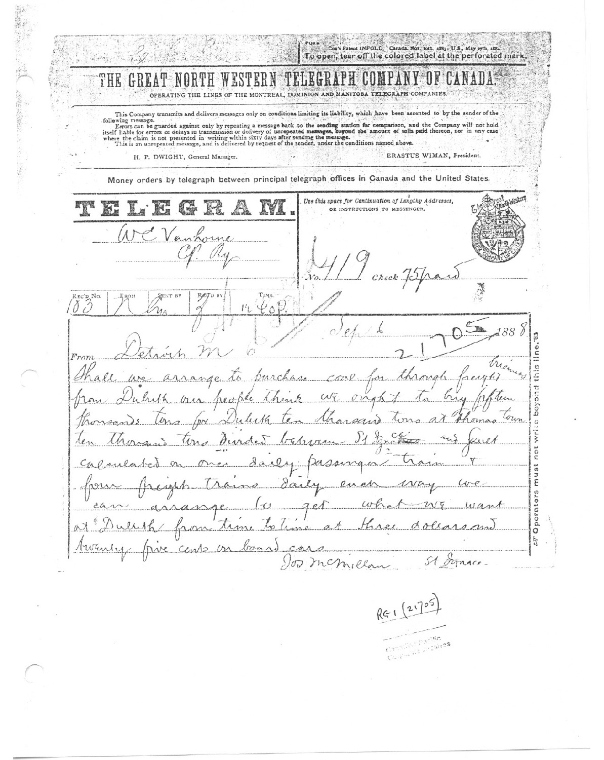 Telegram to W. C. Vanhorne from Joe McMillian. Shall we arrange to purchase coal through freight from Duluth our people think we ought to buy 15 thousand tons.