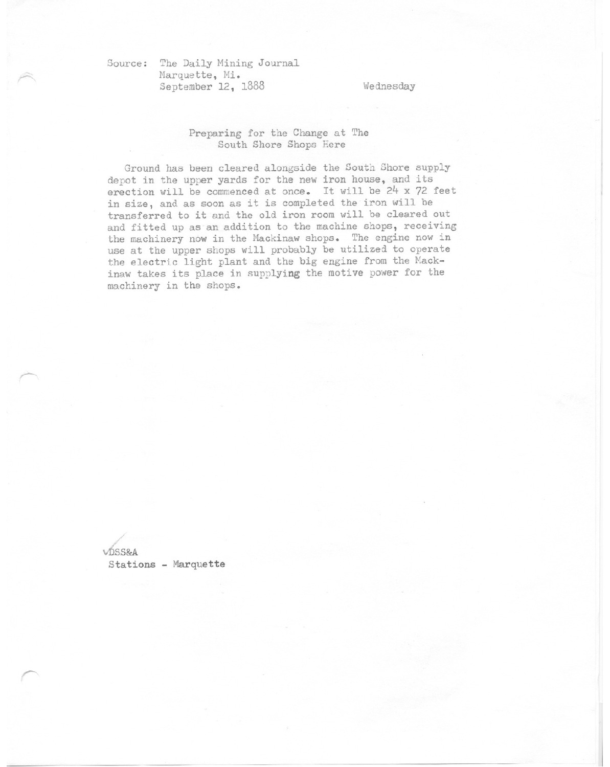 Ground has been cleared alongside the South Shore supply depot in the upper yards for the new iron house, and its erection will be commenced at once.