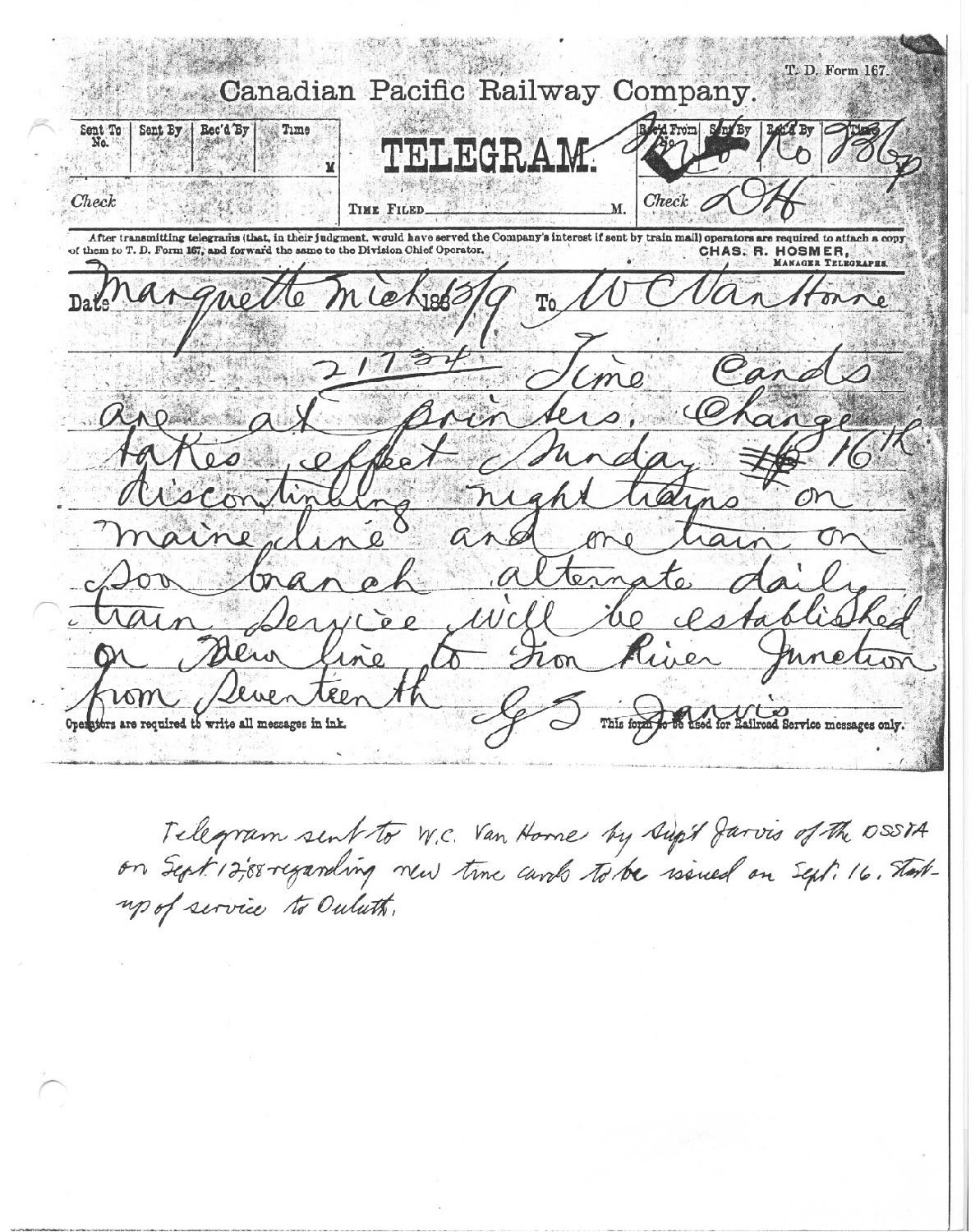 Telegram to W. C. Vanhorne from G. S. Jarvis. Time care at printers. Change take effect Monday 16th.