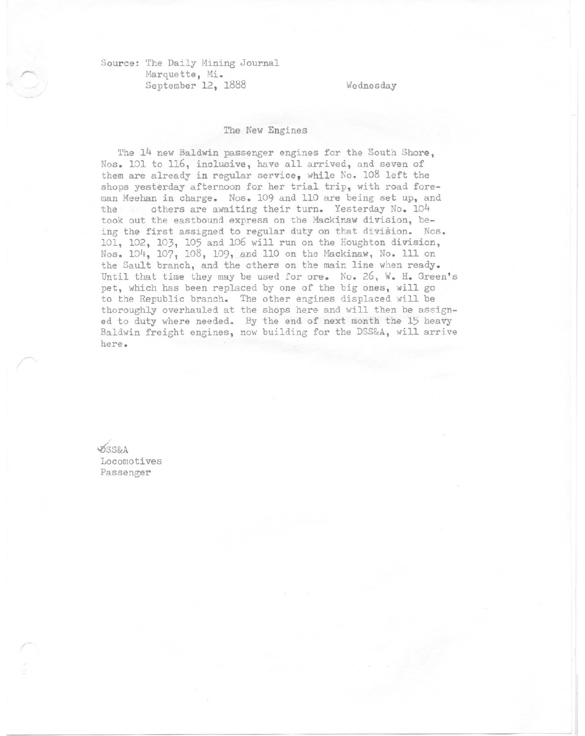 14 new Baldwin passanger engines for the South Shore, Nos 101 to 116 inclusive, have all arrived, and seven of them are already in regular service, while No 108 left the shops yesterday afternoon for her trial trip, with road foreman Meehan in charge.
