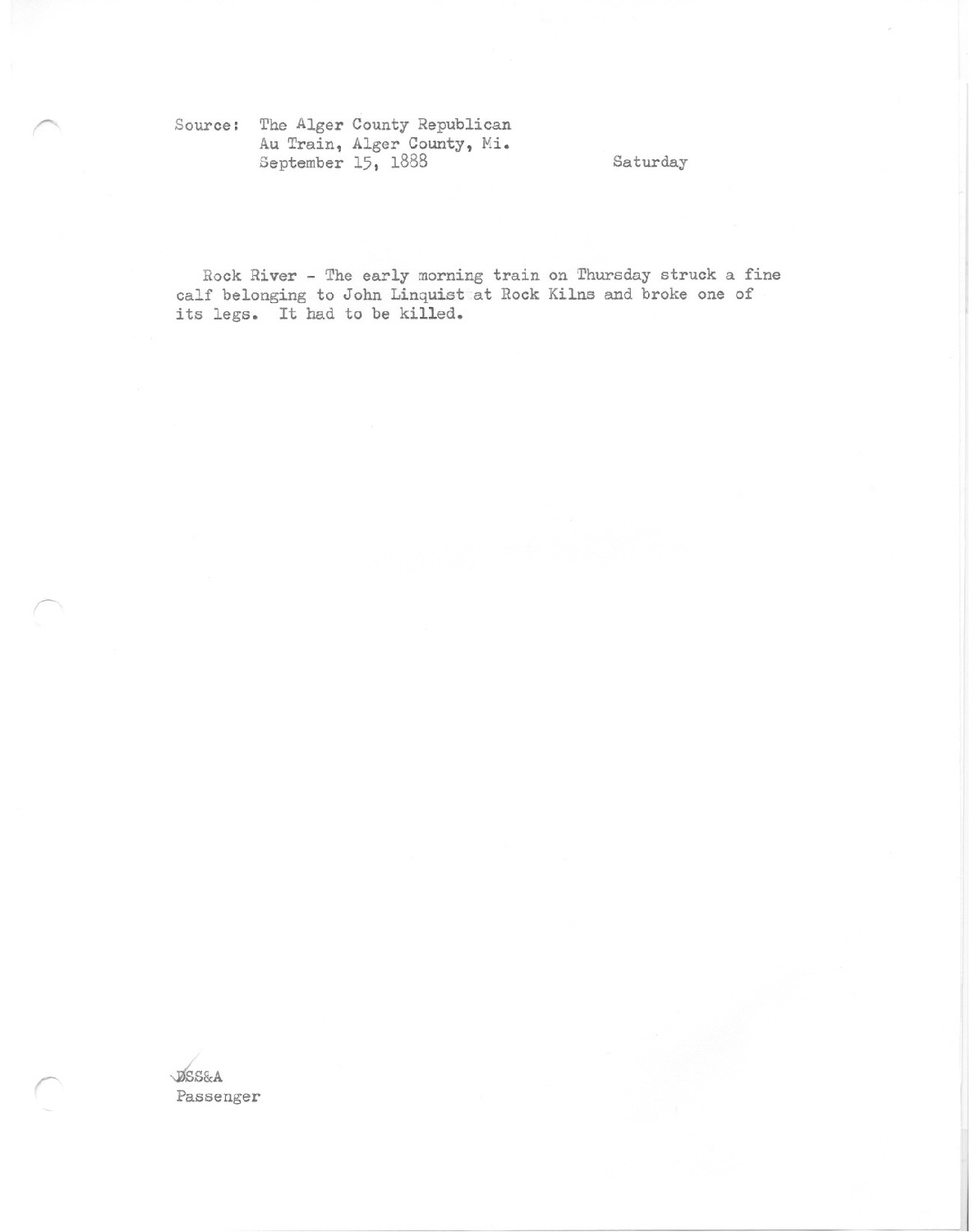 The early morning train on Thursday struck a fine calf belonging to John Linquist at Rock Kilns and broke on of its legs. It had to be killed.