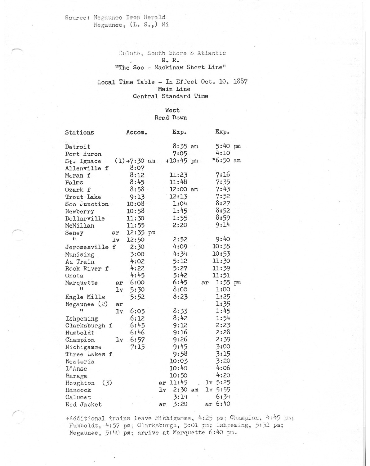Soo-Mackinaw Short Line Local time table in effect October 10, 1887 Main Line, Central standard time.