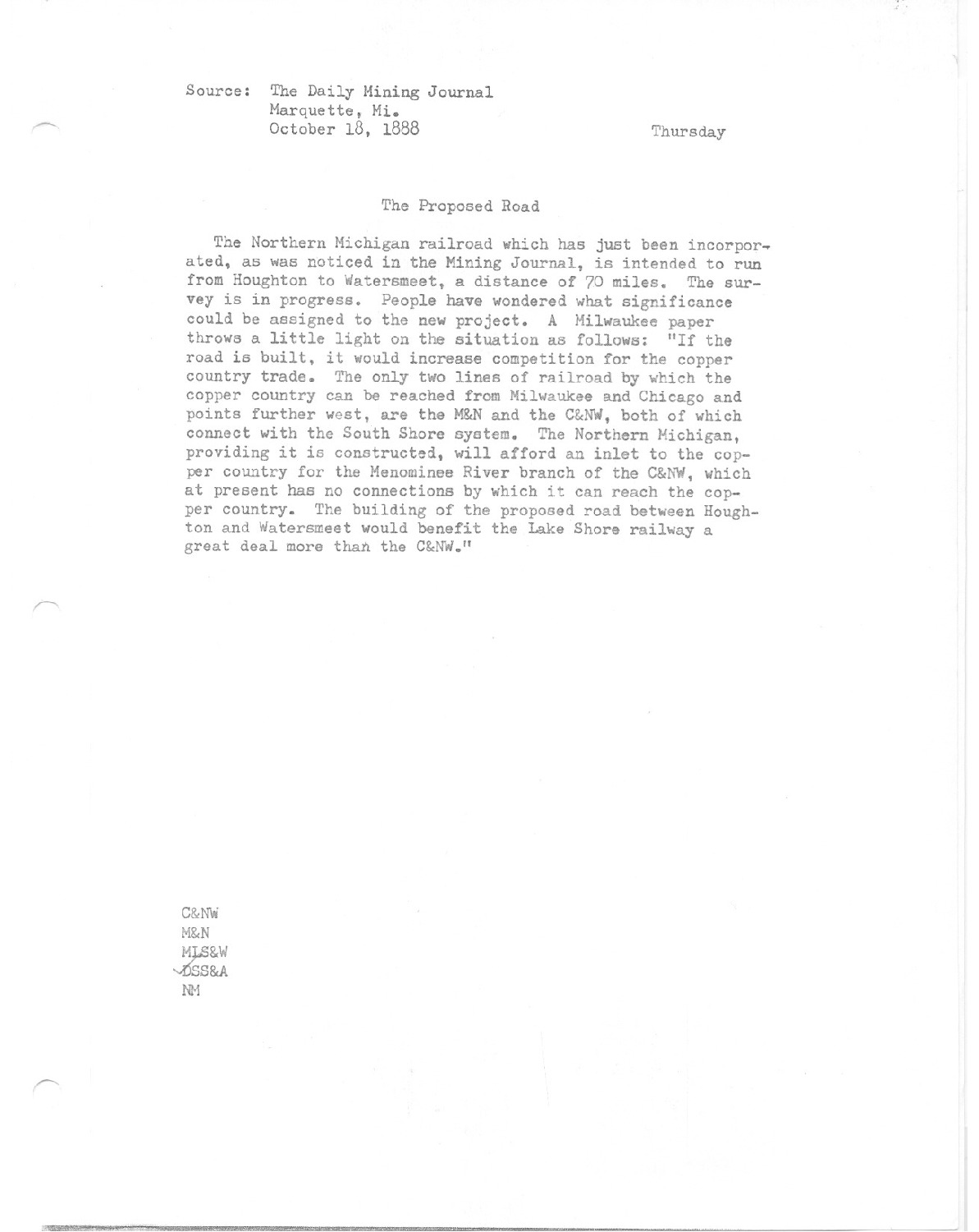 Northern Michigan railroad which has just been incorporated, as was noticed in the Mining Journal, is intended to run from Houghton to Watersmeet, a distance of 70 miles.