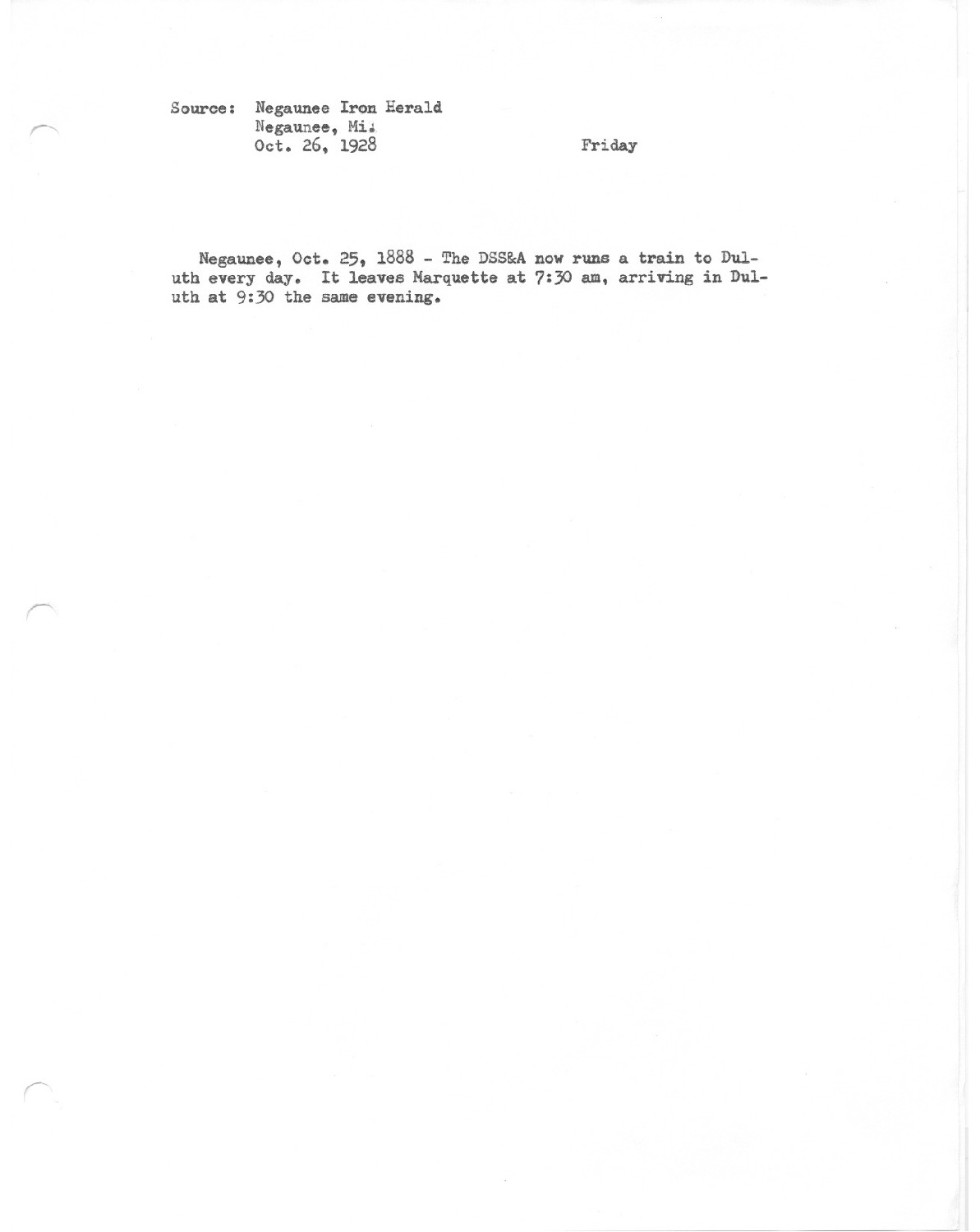 Negaunee, Oct. 25, 1888 - The DSS&A now runs a train