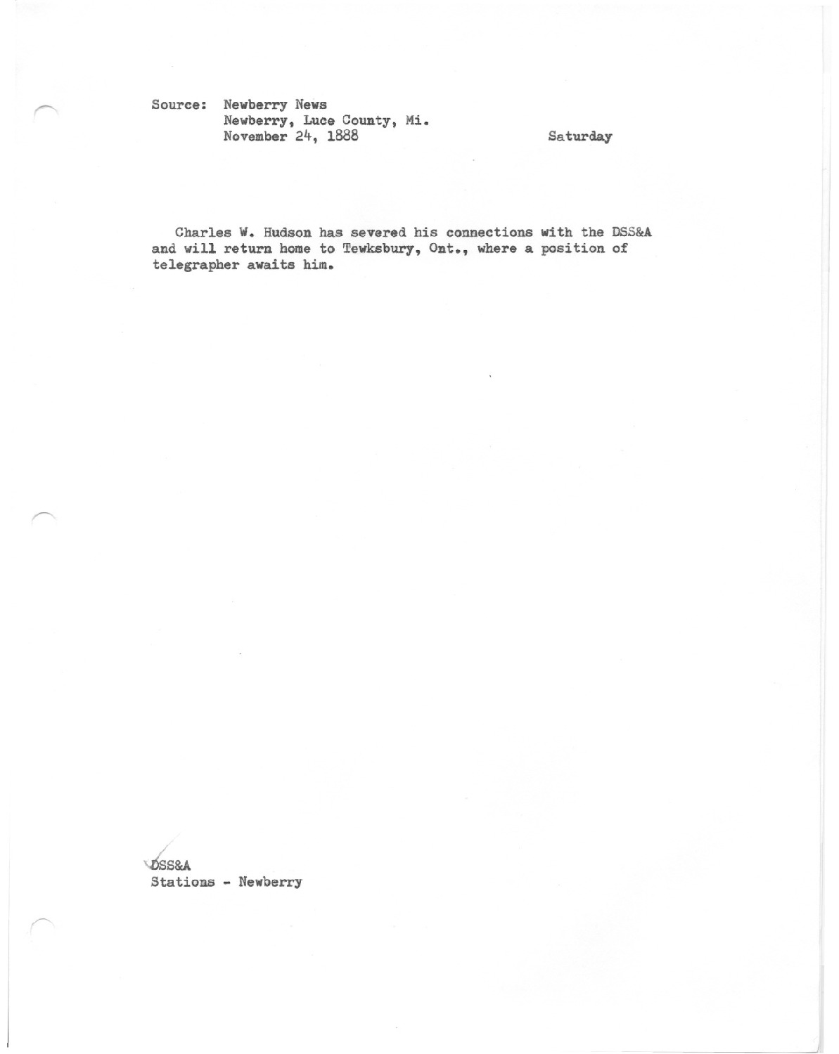 Charles W. Hudson has served his connections with the DSS&A and will return home to Tewsbury, Ontario where a position of telegrapher awaits him.