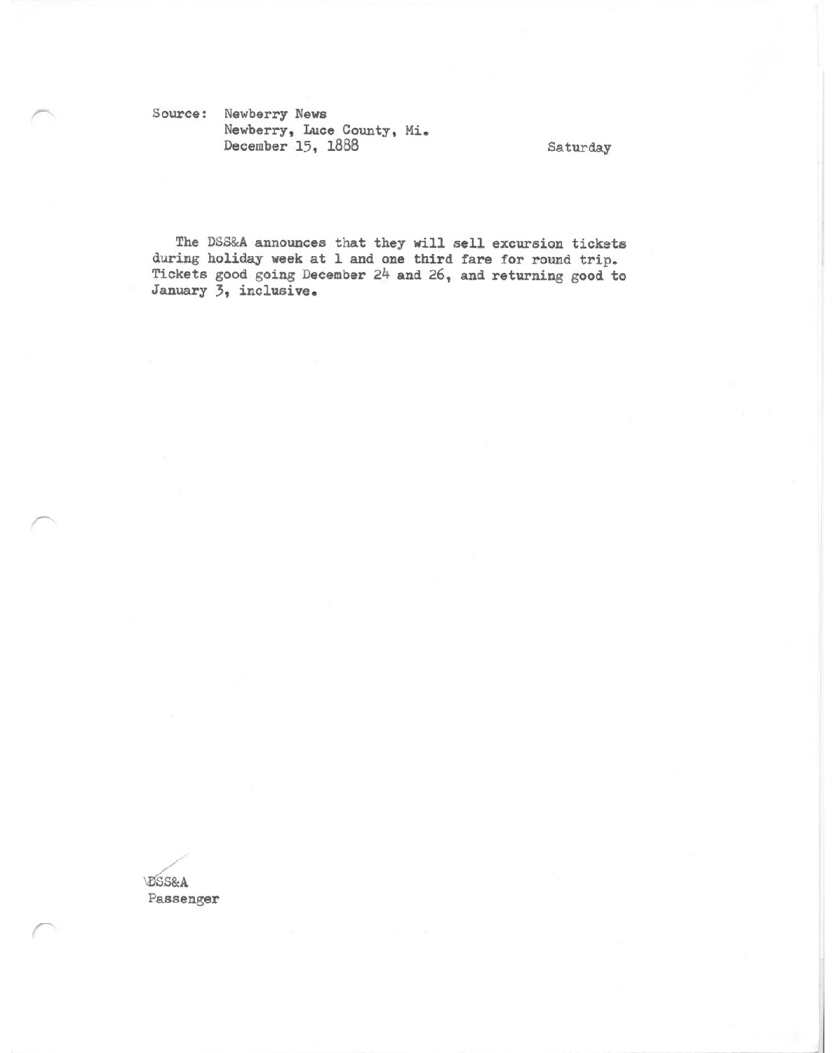 The DSS&A announces that they will sell excursion tickets durning holiday week at 1 and 1/3 fare for round trip. Tickets good going December 24 and 26, and returning good to Janurary 3, inclusive.